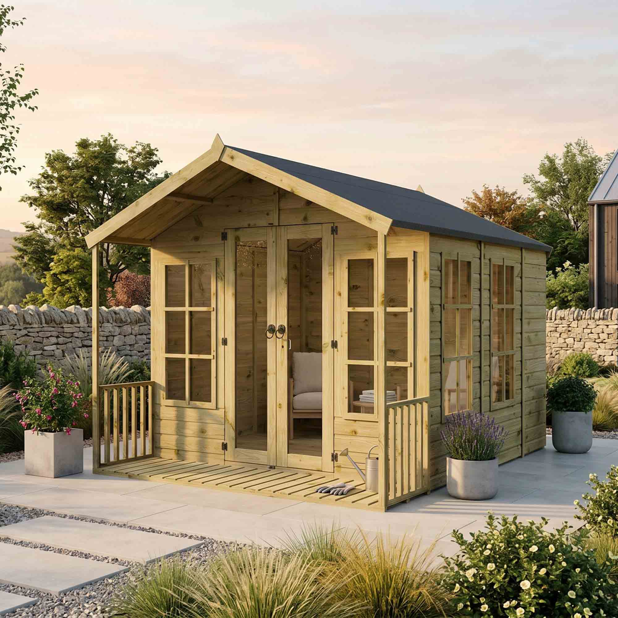 Summer houses in the clearance range feature designs with apex or pent roofs, expansive windows, and double or bifold doors. Depending on whether you prefer a traditional look or a more contemporary feel, you have options with sheltered verandas and attractive railings and others with integrated side sheds.