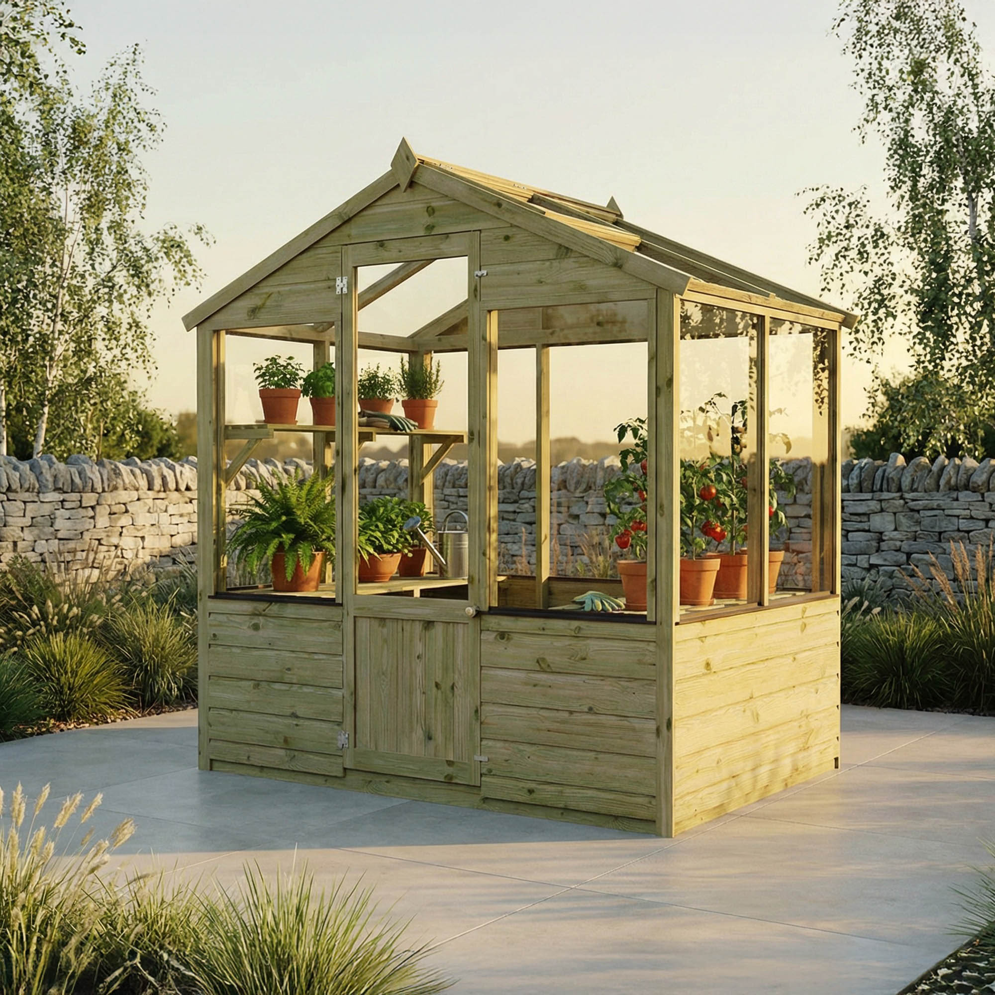 Half-wall greenhouses have a few inches of opaque material at the bottom of each wall so the glazing doesn't reach the ground. This provides shade for those seedlings that can’t handle full sunlight. All the wooden greenhouses in Waltons’ range have a half wall (or ‘dwarf wall).