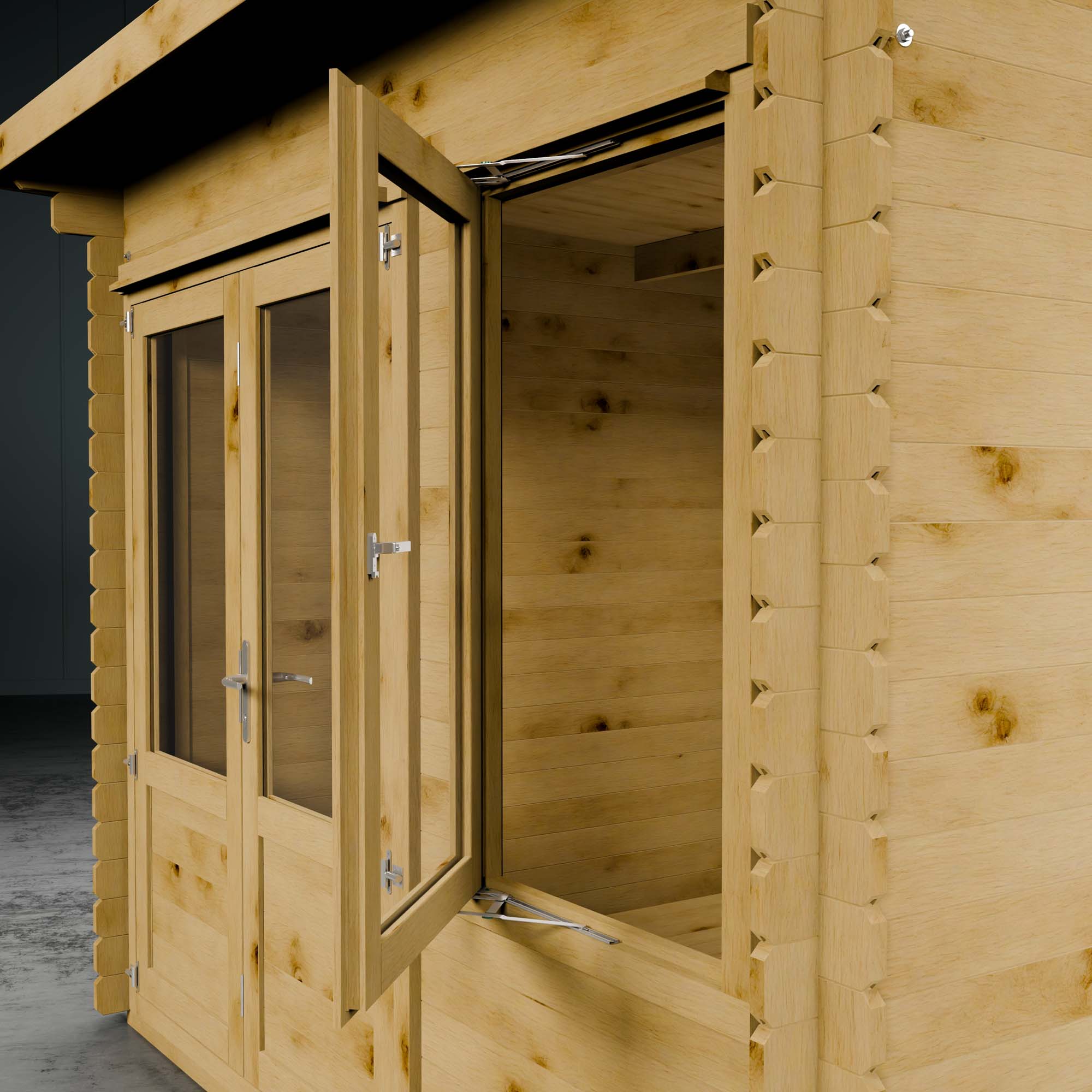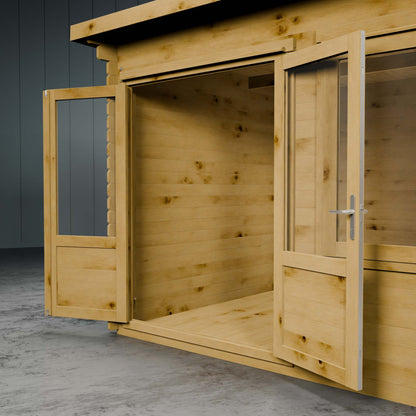 The Cuckoo Log Cabin offers a contemporary and spacious garden structure, perfect for those seeking a space to pursue hobbies, entertain guests, or simply unwind in the garden. With fully glazed doors and an additional half length window, the interior is bright, airy, and inviting. The windows and doors are double glazed, giving a cooling effect in summer and retaining heat during the winter.