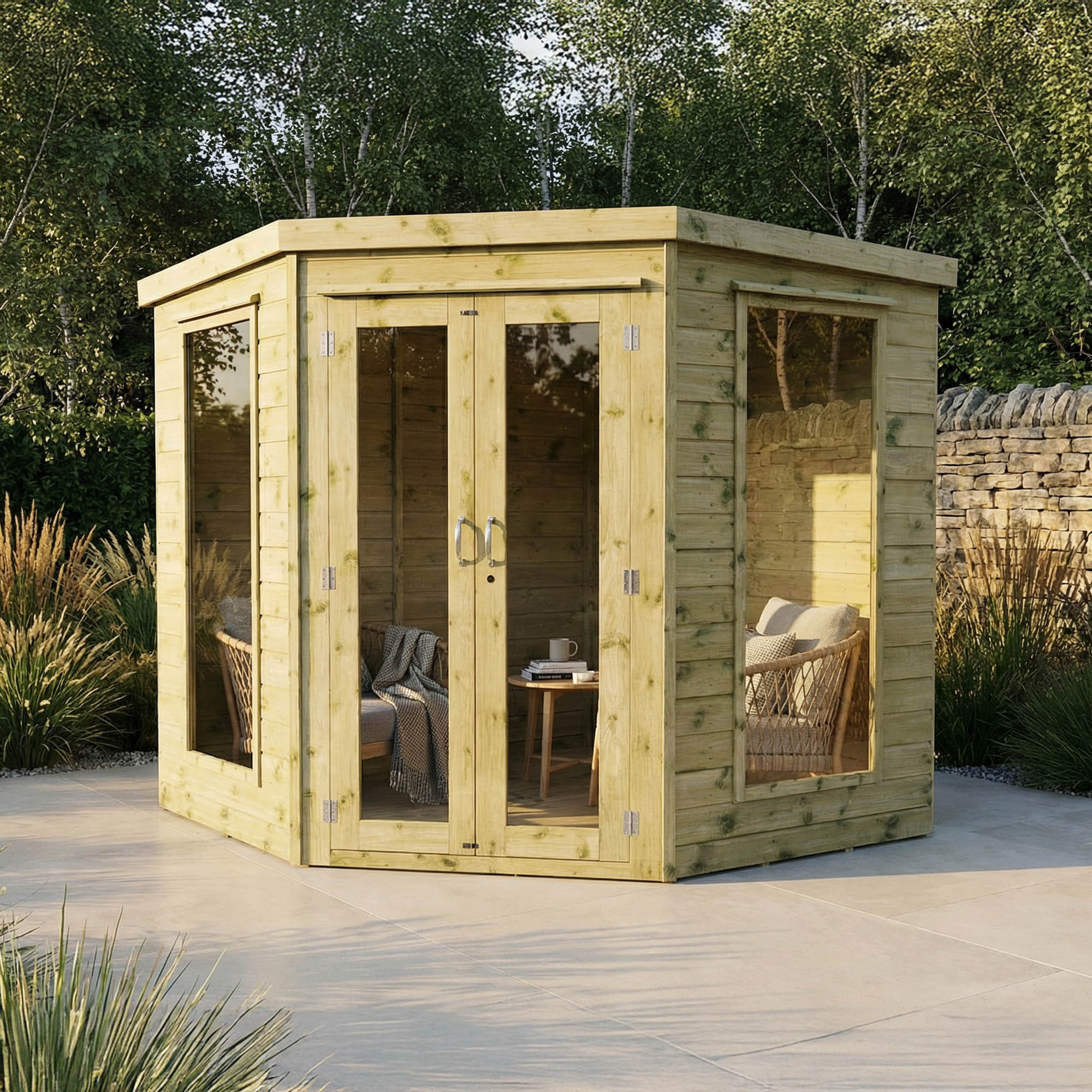 If you're in search of a versatile space for crafting, entertaining, or simply unwinding after a long day, Our Premier Corner Summerhouse may just fit the bill. Designed to fit snugly into the corner of your garden, it offers panoramic views and maximises your available space, leaving more outdoor space for other features. Its two fixed windows and fully glazed French doors, all featuring shatterproof styrene, fill the interior with natural light, creating a warm and inviting atmosphere.
