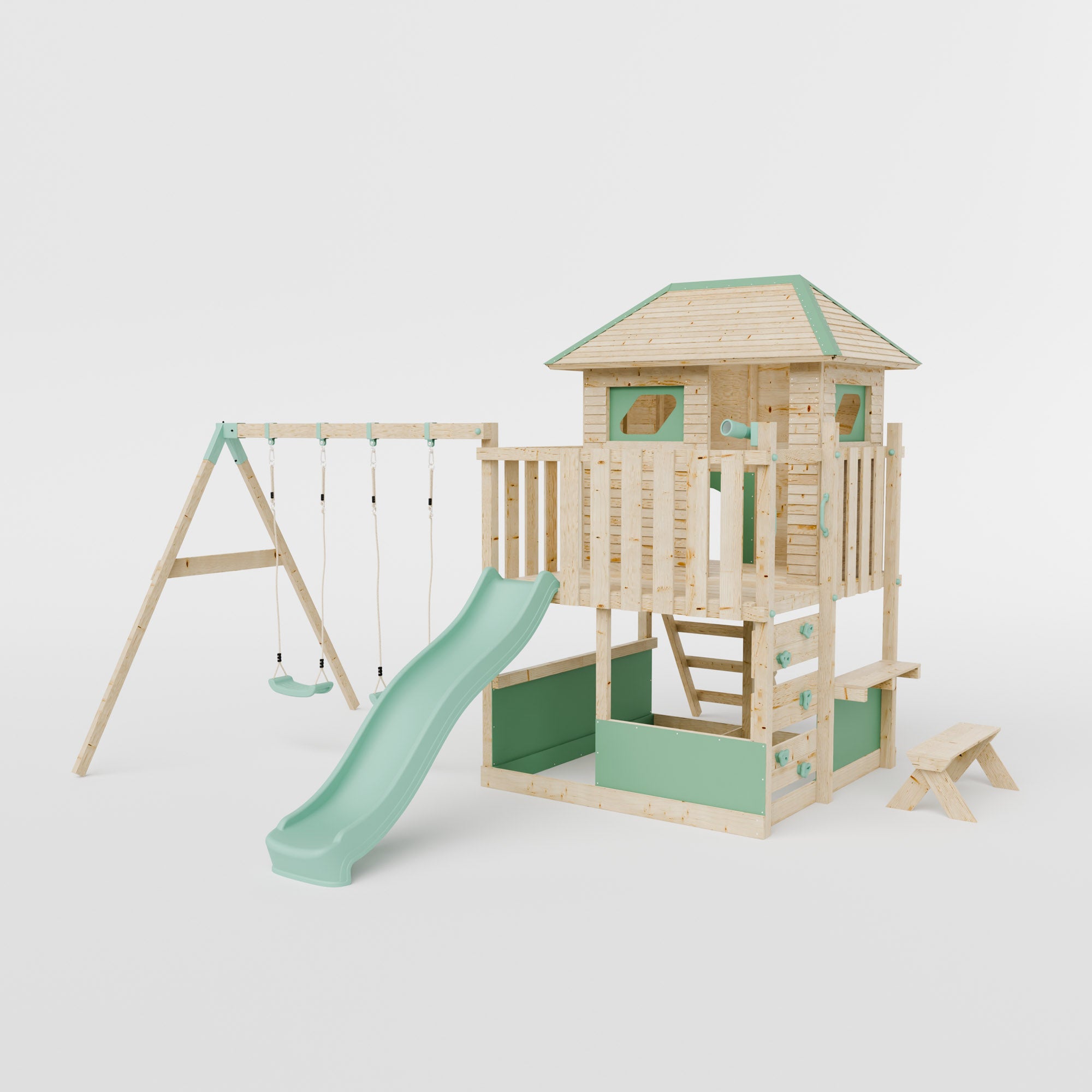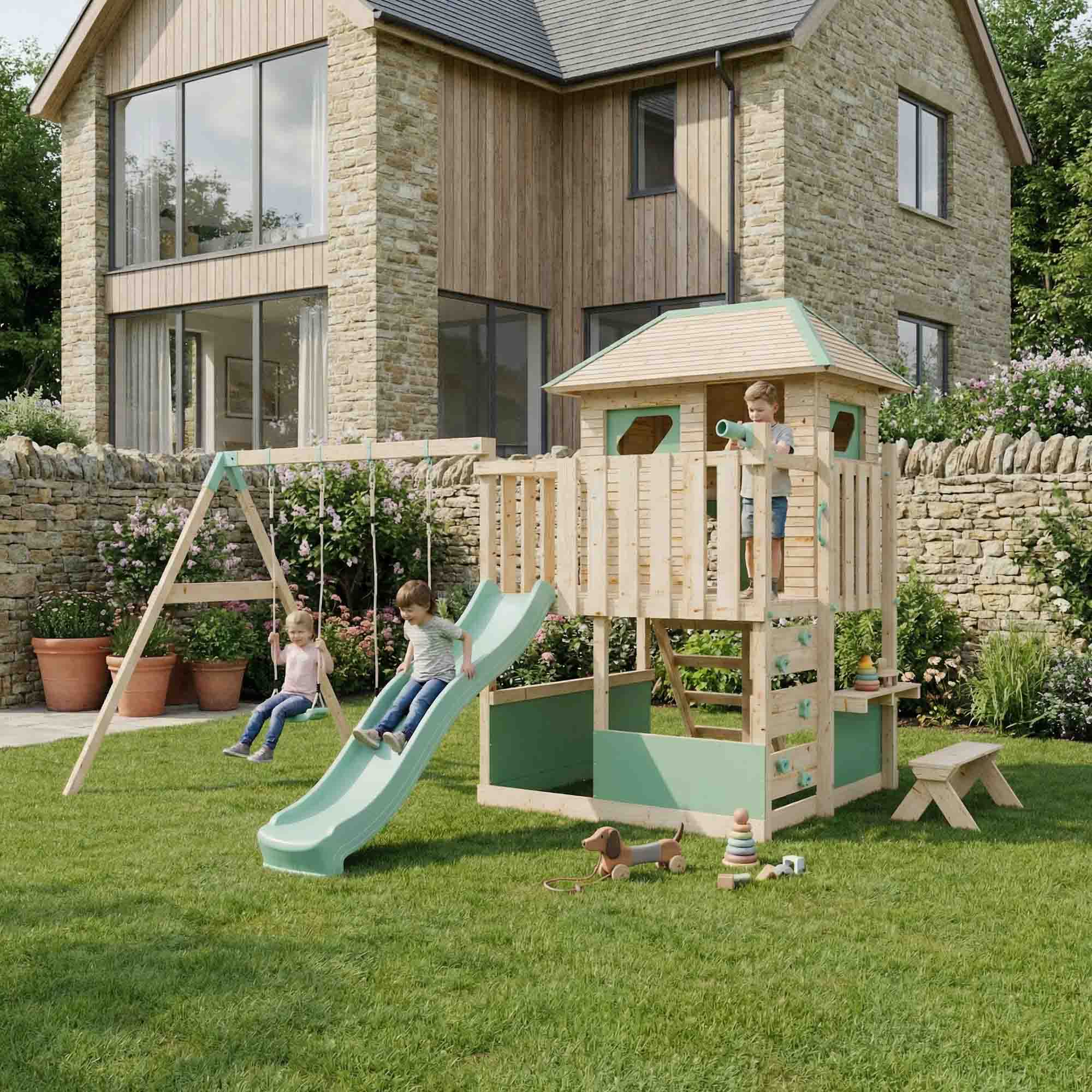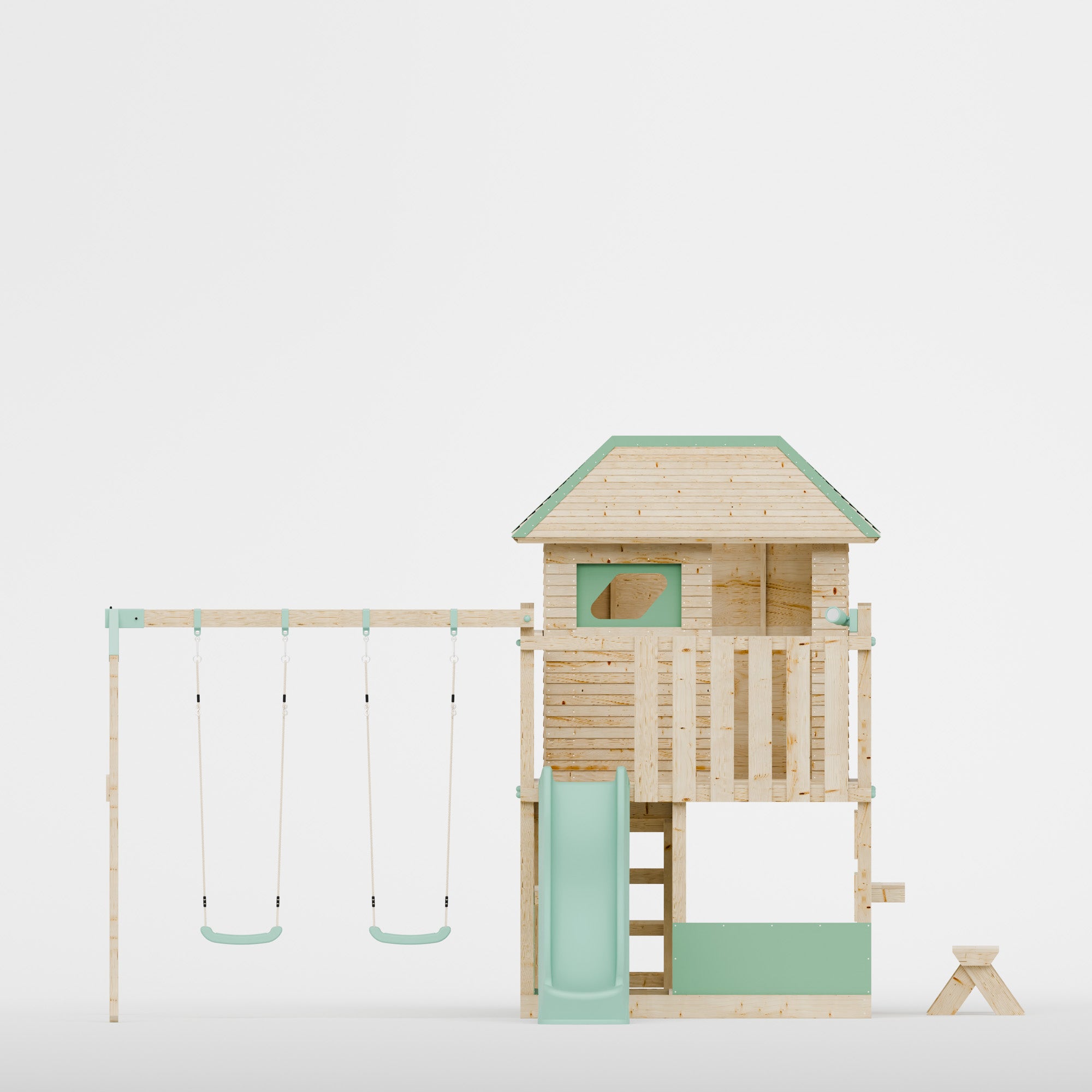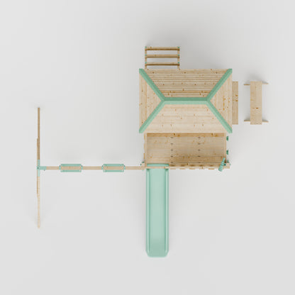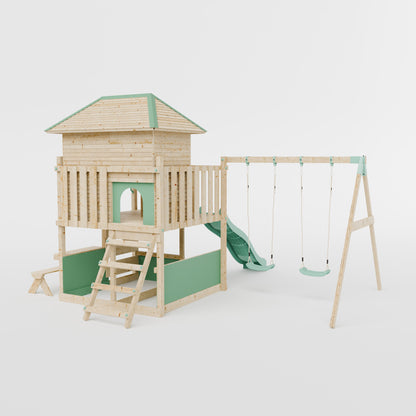The LittleSummit range is the apex of design, safety and outdoor fun. The It's Scandinavian inspired design, with it's chemical free wood and blue pastel accents, creates an engaging play centre for your children and an aesthetically pleasing garden addition for you. The playhouse atop of the tower creates a vast environment for imaginative play and creative expression with a slide, shopfront, bench and a covered interior cubby the imaginative play is endless. Also included in this set is a double swing attached with industry leading brackets and fastening methods. The double swing can either feature two single swings or a single swing and baby swing, allowing you to customise your set to whatever is best for your family.