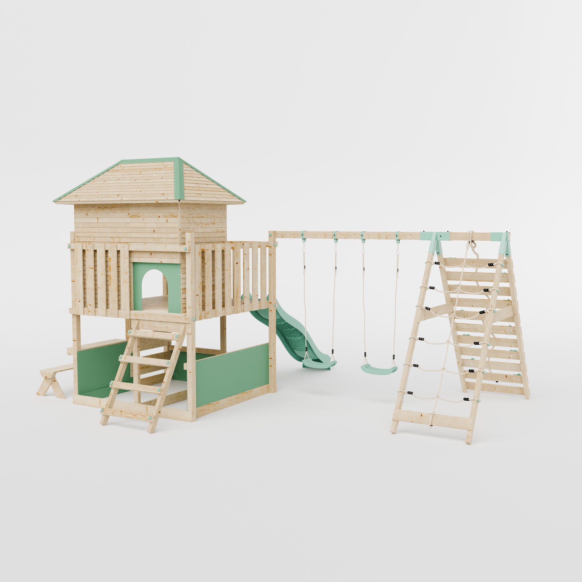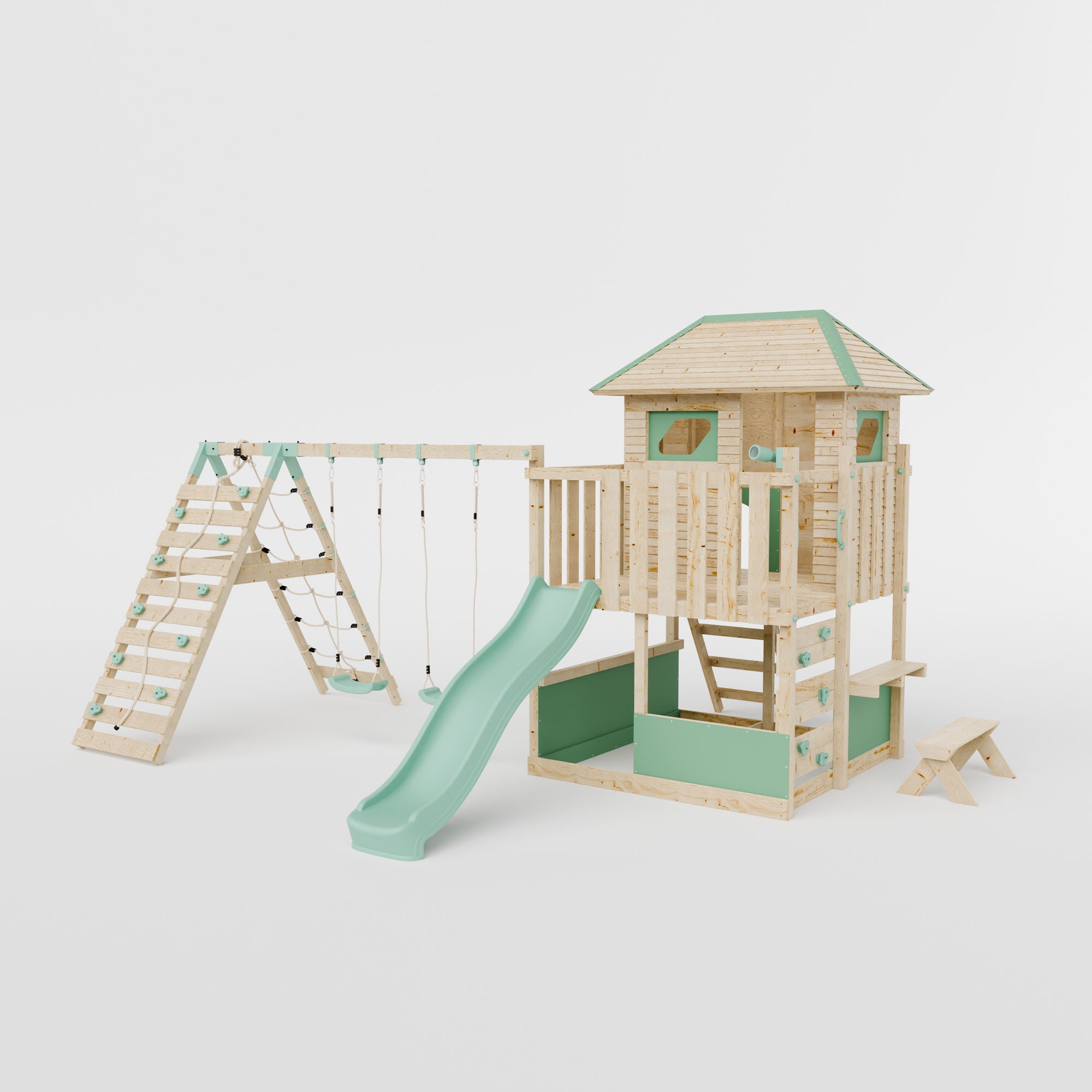 The untreated natural wood finish is chemical-free and eco-friendly, blending seamlessly into outdoor spaces while giving you the freedom to choose your own protective treatment; clear, coloured, or left natural, for both durability and style. With our extensive range of climbing frame components, you can decide what’s included. From double swings to baby swings to monkey bars, you can design the perfect climbing frame for your space.