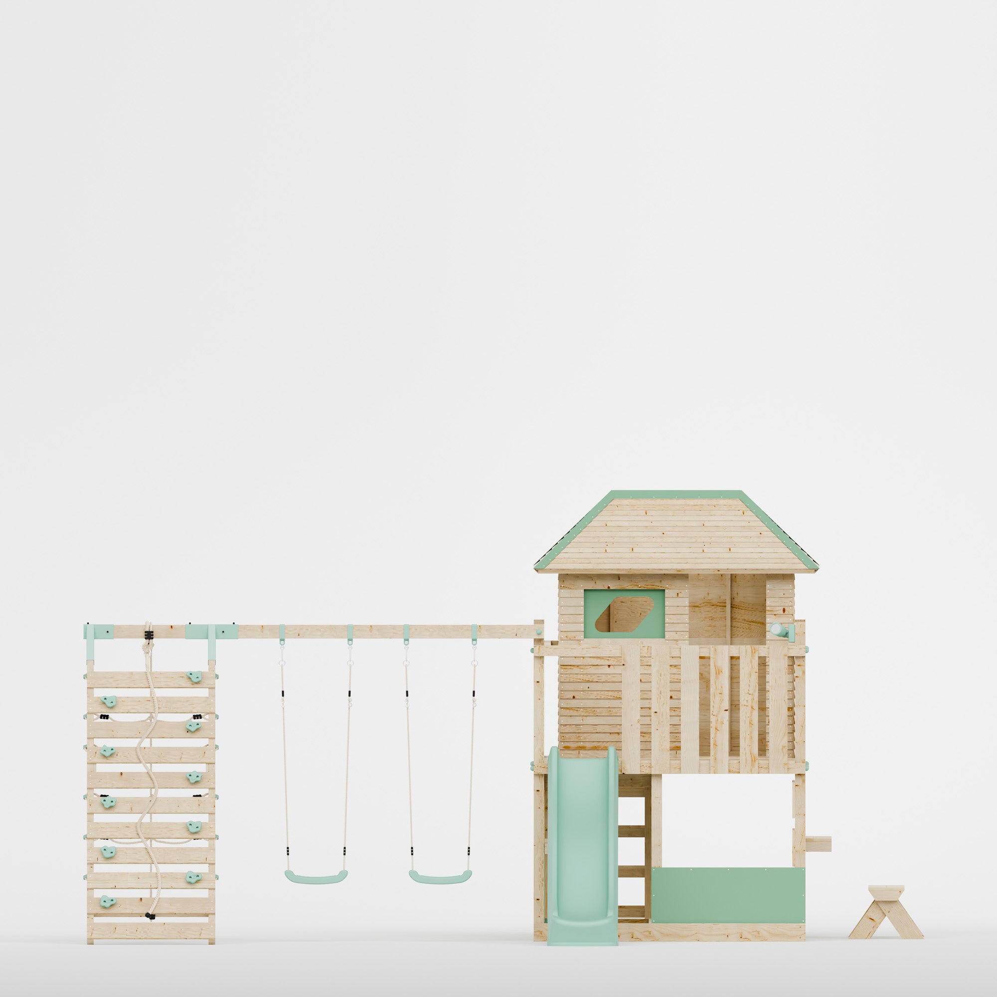 The climbing wall creates two different areas of play, on one side an angled rock climbing wall with safety rope and on the other a rope climbing wall allowing for multple routes for intrepid little climbers to reach the top. The double swing can either feature two single swings or a single swing and baby swing, allowing you to customise your set to whatever is best for your family.
