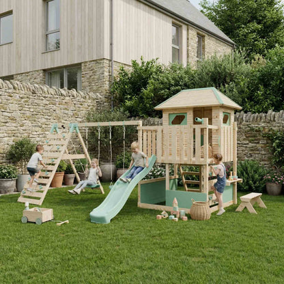 The LittleSummit range is the apex of design, safety and outdoor fun. The It's Scandinavian inspired design, with it's chemical free wood and blue pastel accents, creates an engaging play centre for your children and an aesthetically pleasing garden addition for you. The playhouse atop of the tower creates a vast environment for imaginative play and creative expression with a slide, shopfront, bench and a covered interior cubby the imaginative play is endless. Also included in this set is a double swing and climbing wall attached with industry leading brackets and fastening methods.