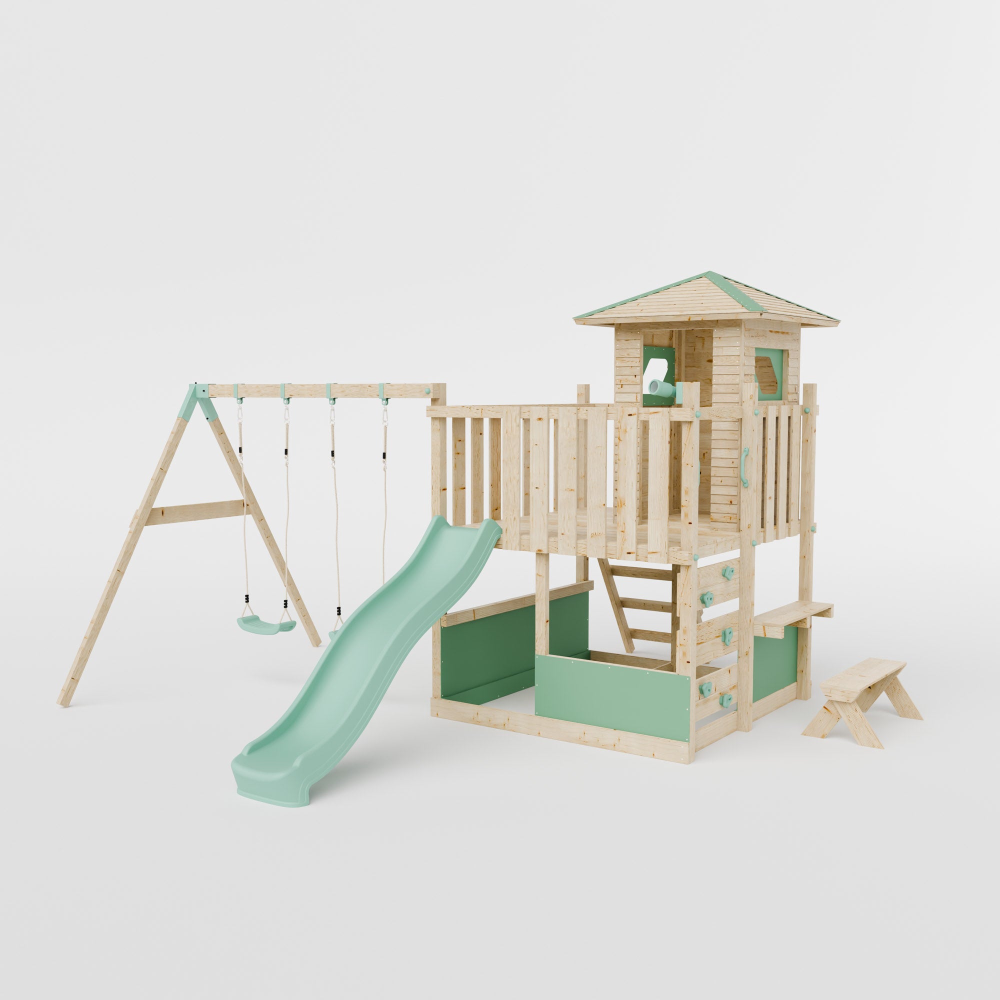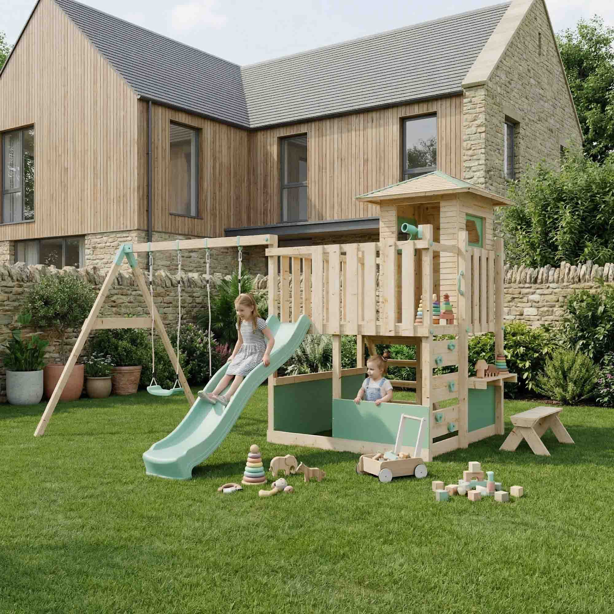 The untreated natural wood finish is chemical-free and eco-friendly, blending seamlessly into outdoor spaces while giving you the freedom to choose your own protective treatment; clear, coloured, or left natural, for both durability and style. With our extensive range of climbing frame components, you can decide what’s included. From double swings to baby swings to monkey bars, you can design the perfect climbing frame for your space.