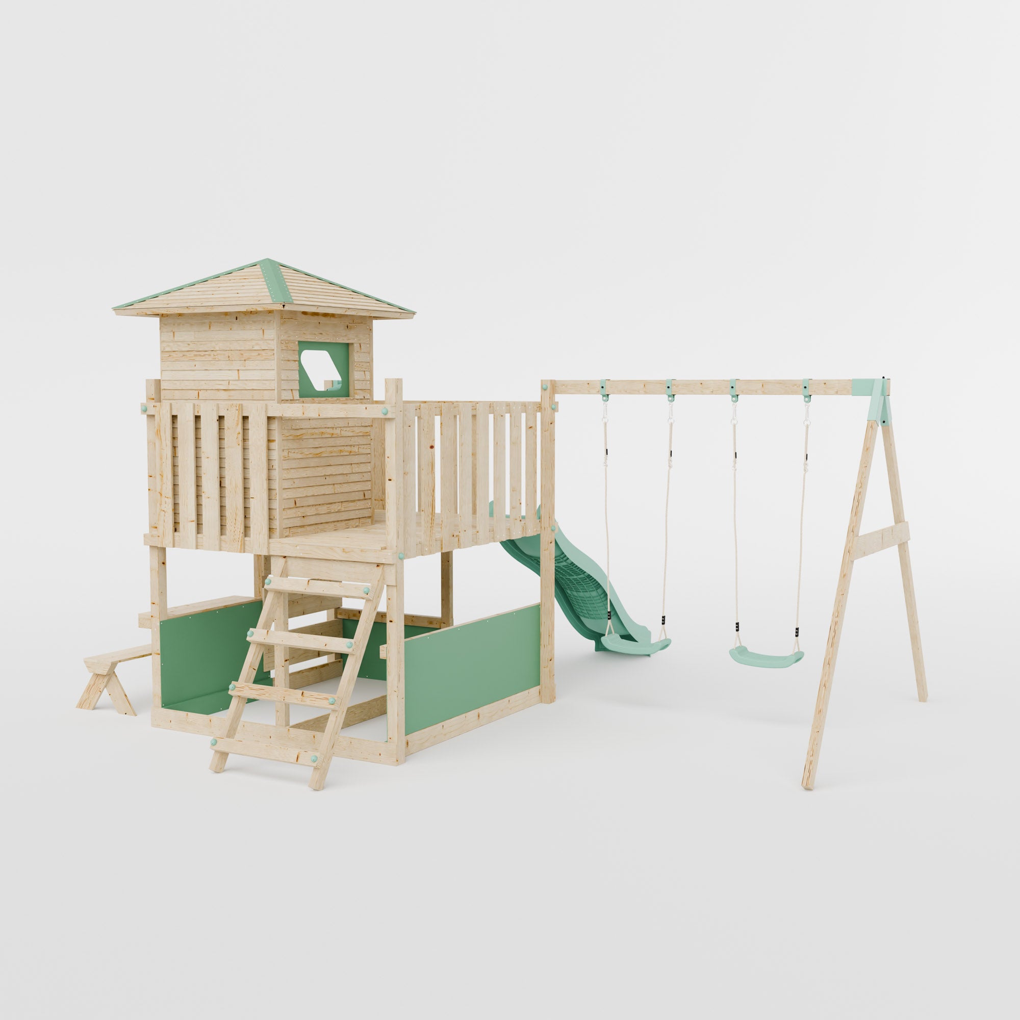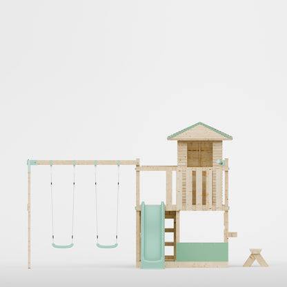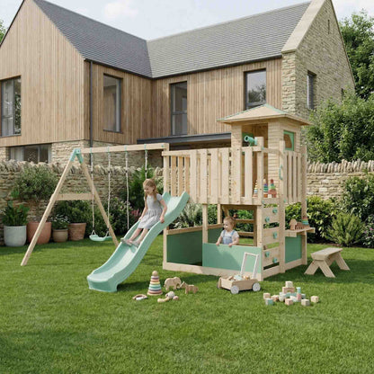 The LittleSummit range is the apex of design, safety and outdoor fun. The It's Scandinavian inspired design, with it's chemical free wood and blue pastel accents, creates an engaging play centre for your children and an aesthetically pleasing garden addition for you. The small playhouse sits atop of the platform, like a treehouse without the tree, a secluded sanctuary to create and play with a slide, shopfront, bench and a covered interior cubby the imaginative play is endless. Also included in this set is a double swing attached with industry leading brackets and fastening methods. The double swing can either feature two single swings or a single swing and baby swing, allowing you to customise your set to whatever is best for your family.