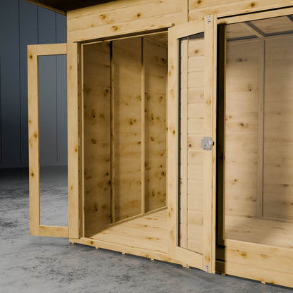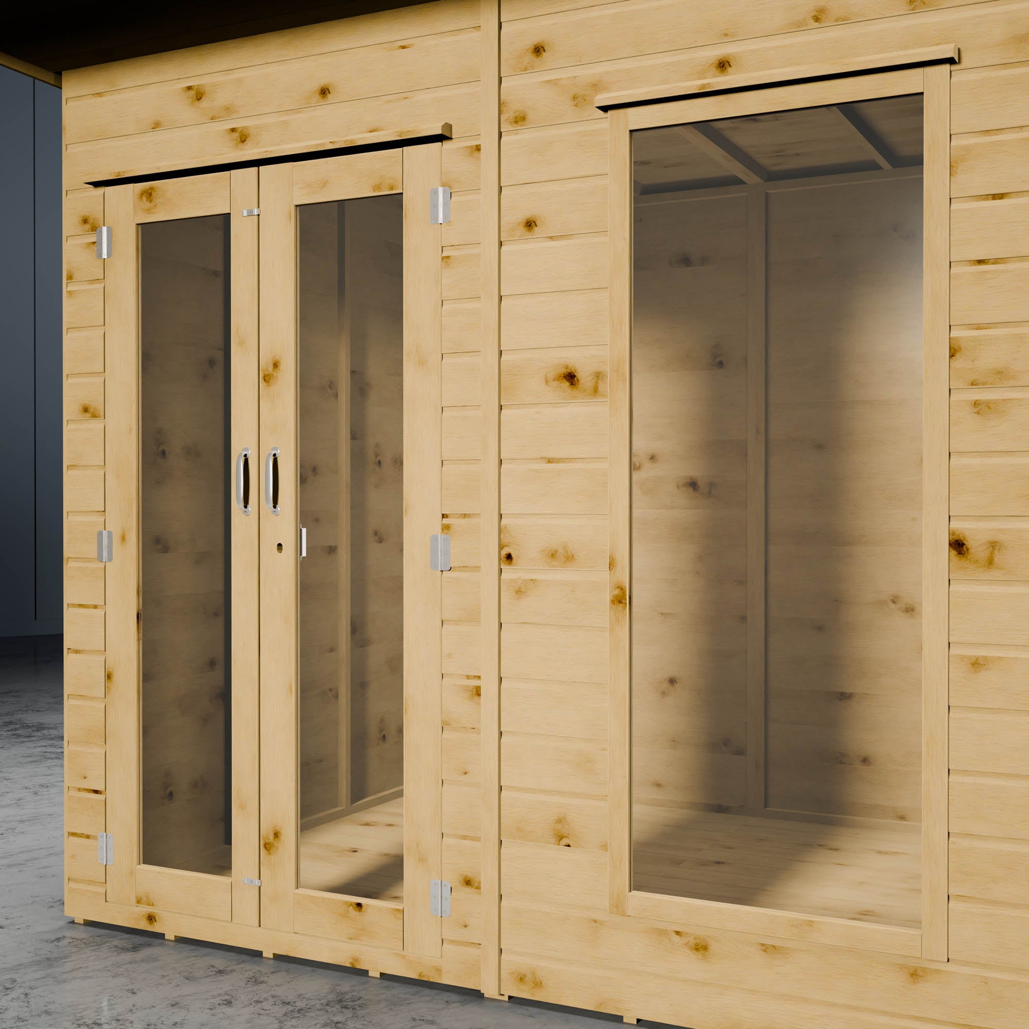 Sit back and relax inside the Maine Summerhouse. With fully glazed french doors and three fixed full-length windows, all glazed with shatterproof styrene, the interior of this summerhouse is bright, airy and welcoming. The doors are finished with brushed chrome handles and hinges for a contemporary aesthetic.
