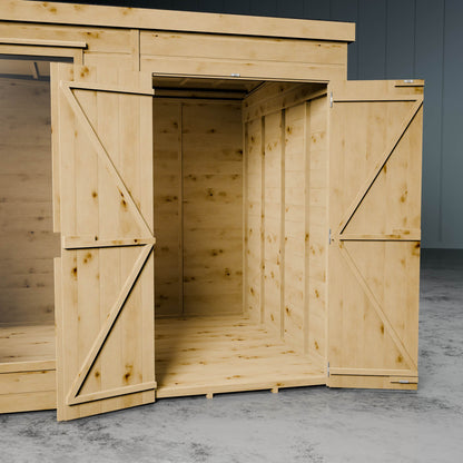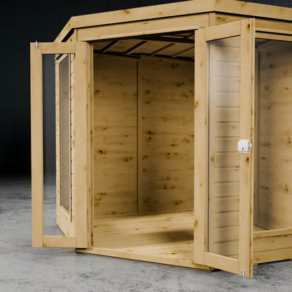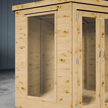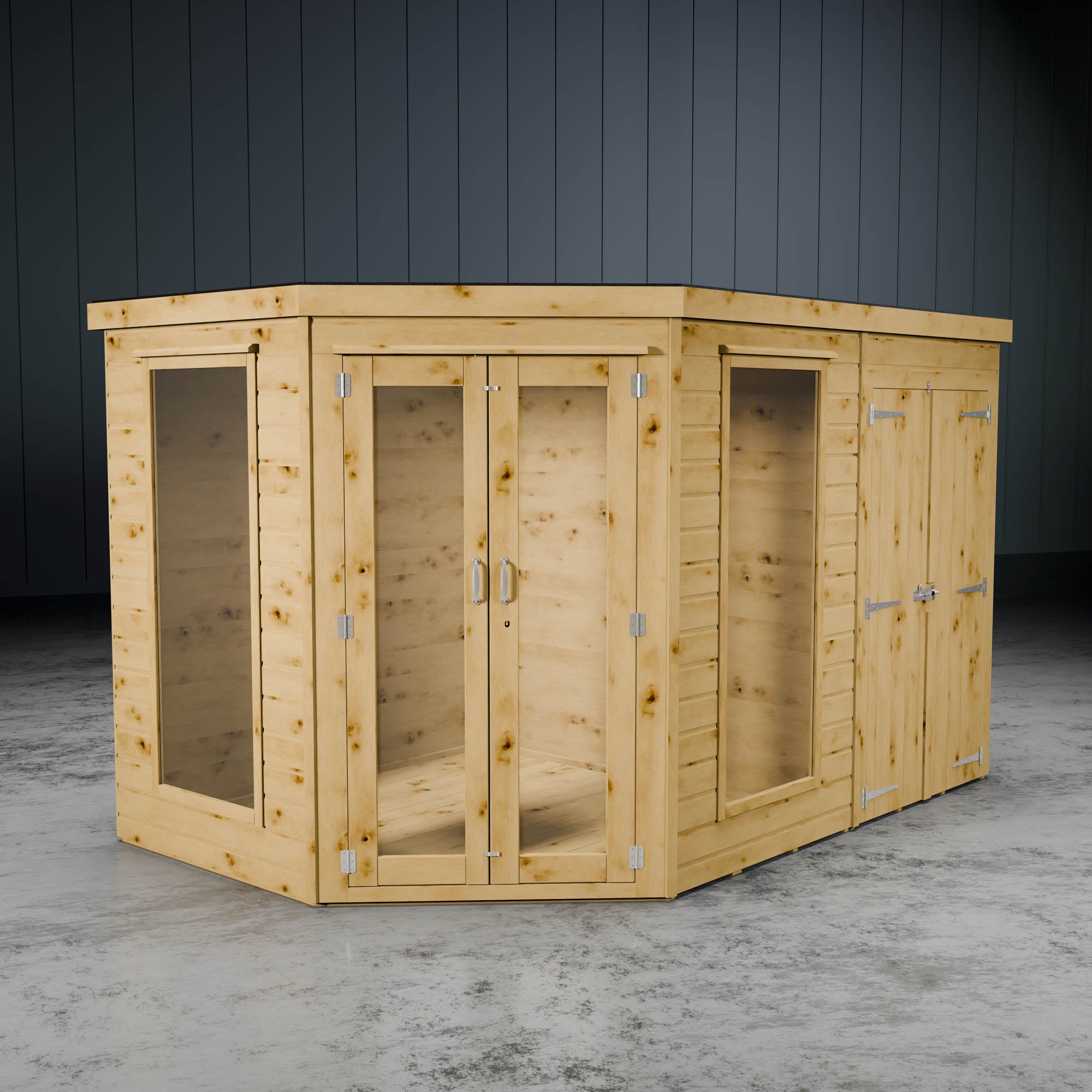 With its pent roof design, the Corner Summerhouse with Side Shed offers a sleek and contemporary design. Its sloped roof helps the building tuck away unnoticed in any garden space, whilst providing a cosy and snug inside feel.