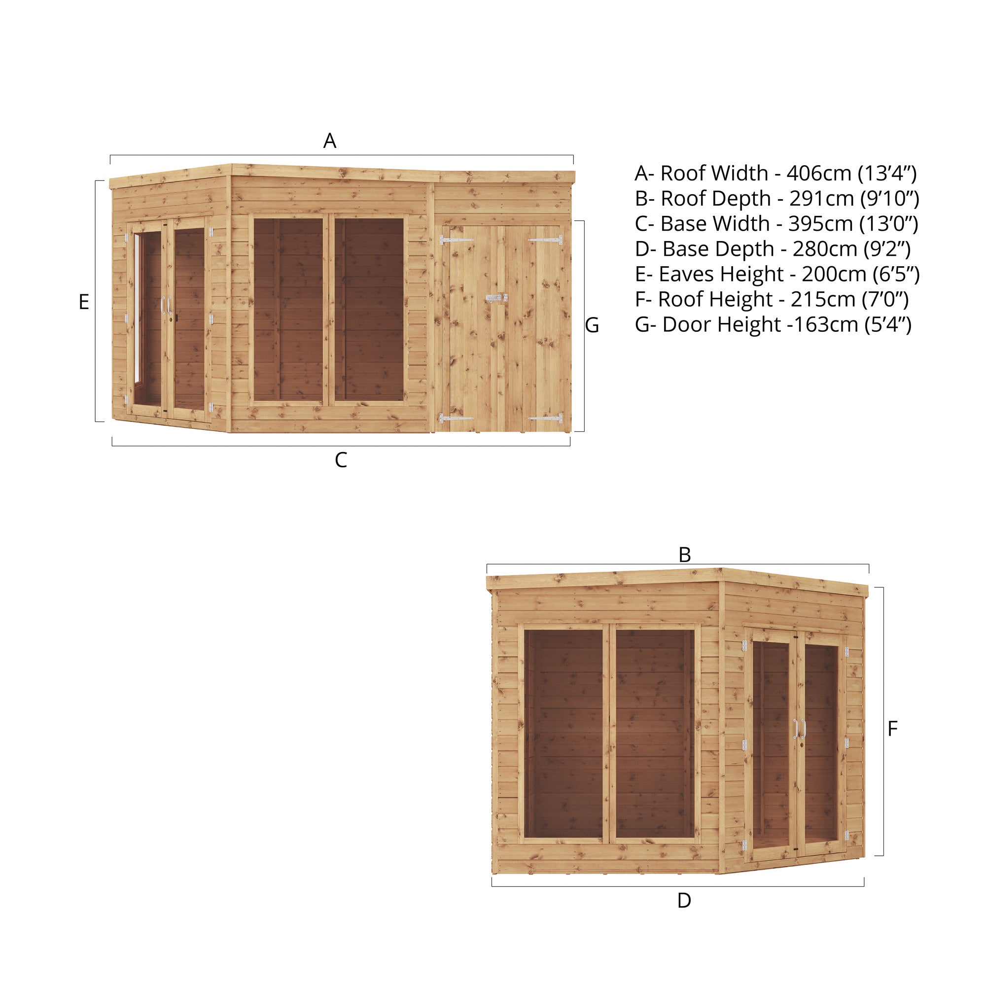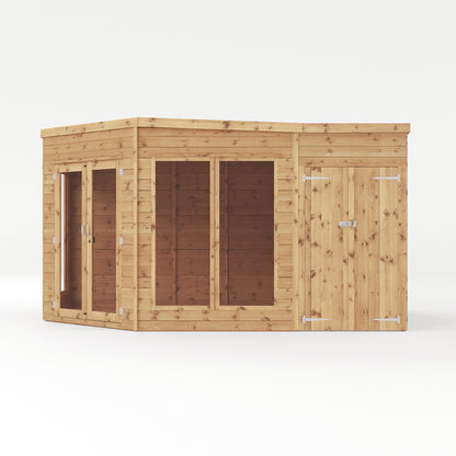 With its pent roof design, the Corner Summerhouse with Side Shed offers a sleek and contemporary design. Its sloped roof helps the building tuck away unnoticed in any garden space, whilst providing a cosy and snug inside feel.