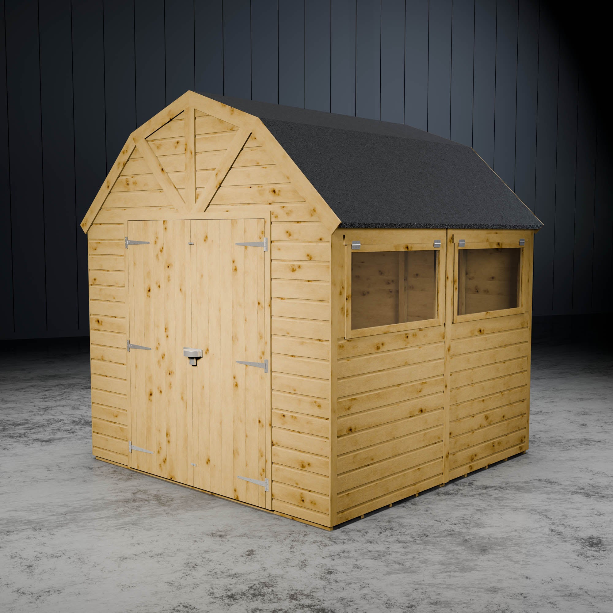 Our Premium Dutch Barn Shed is a unique and spacious storage solution. The smaller of our dutch barns, the spacious interior is ideal for storing any outdoor equipment you'd like away from your home, or even seasonal items such as Christmas decorations. The stylish Dutch barn roof also provides this shed with a generous roof height. Making it the ideal place to store tall items such as strimmers and ladders. Featuring double doors, this shed makes accessing and storing your items super easy. An opening Styrene glazed window floods this shed with light, creating a bright and welcoming interior. Perfect if you are planning to use this space as a functioning workshop or hobby room. We manufacture this building here in the UK, using sustainably sourced and certified timber.