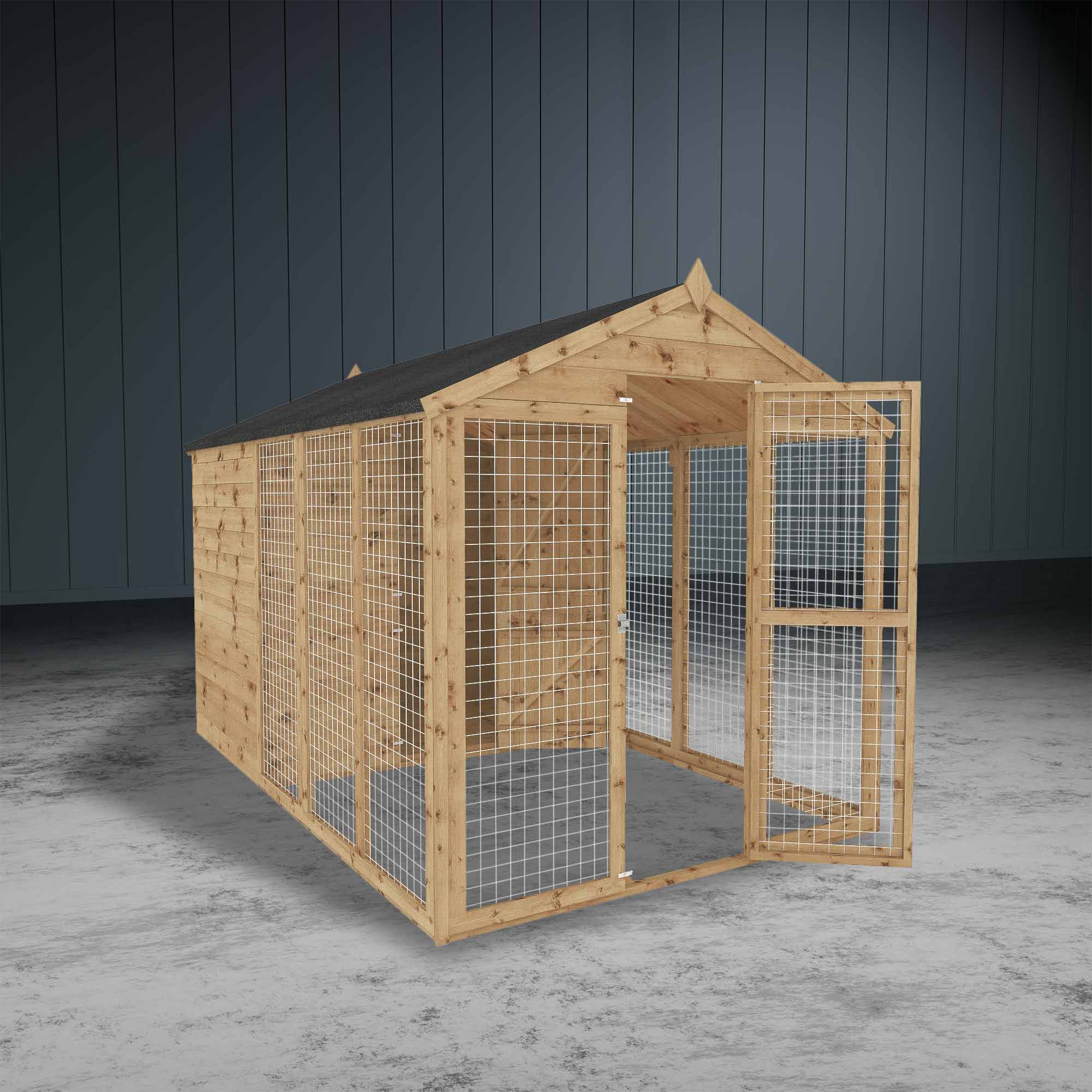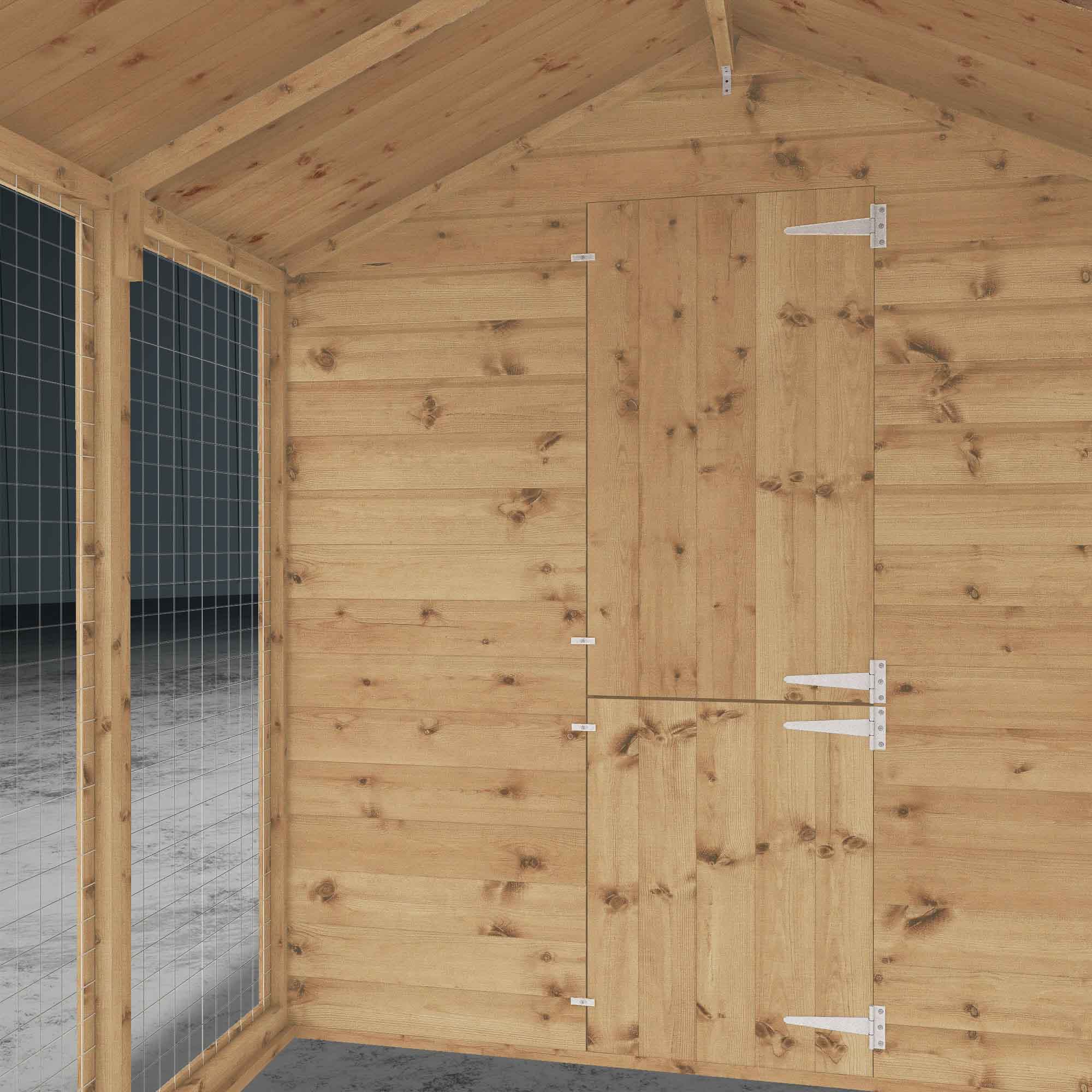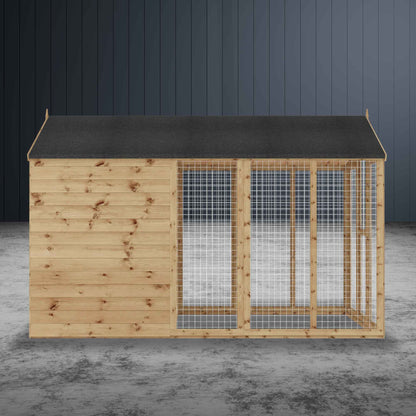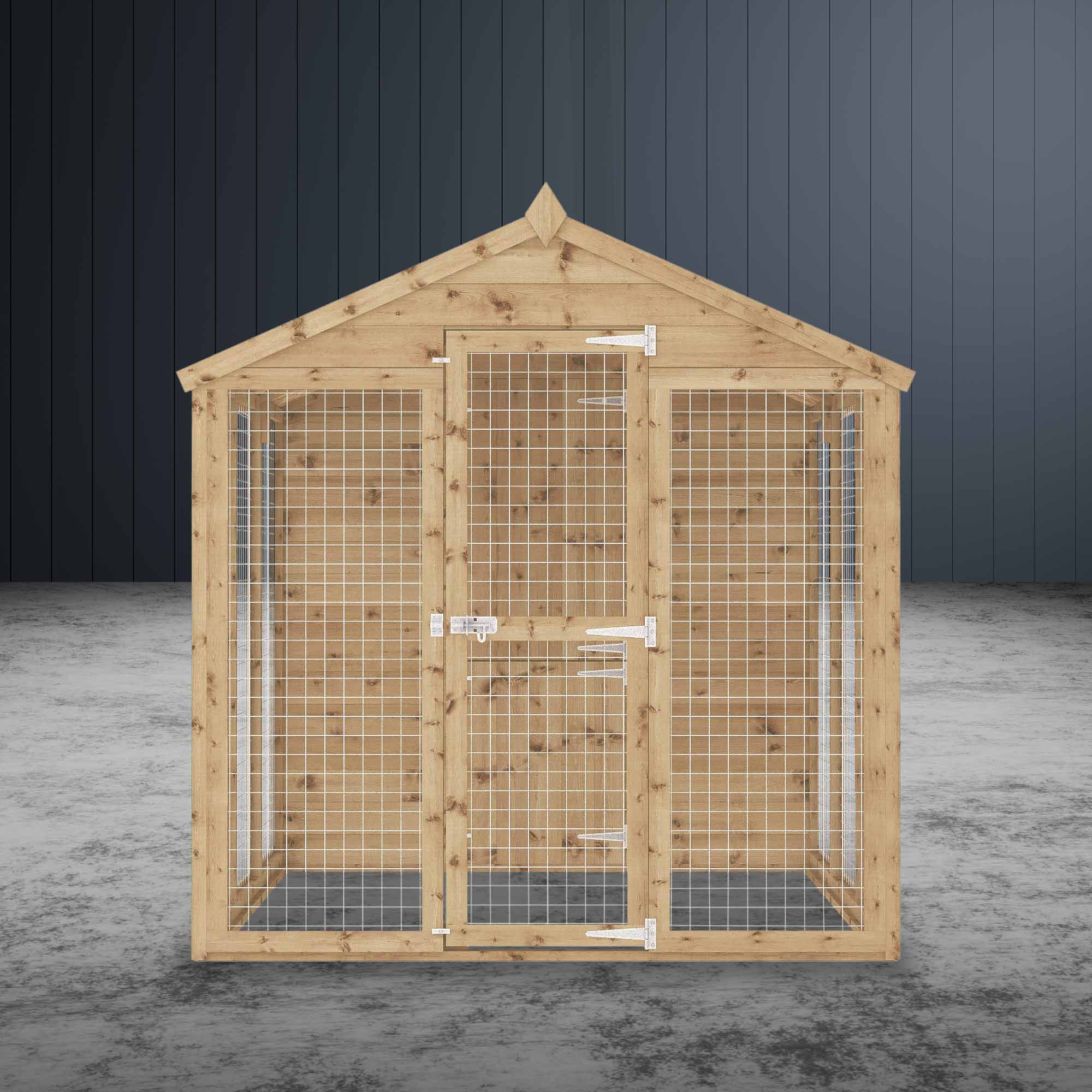 The walls, floor and roof are made using interlocking 12mm Tongue & Groove cladding; this creates a solid structure that is guaranteed to offer many years of reliable service. Two doors feature in this dog kennel, one that enters the sheltered area and one that enters the open faced section. A small doorway connects the sheltered area and run itself so your dog is never restricted. The mesh used in the front of the panel is galvanised, this increases the longevity of the building.