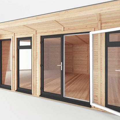 These UPVC double doors in anthracite finish are modular in design and can be located on any side of the building. They come with a high quality brushed steel door furniture and 14mm thick argon filled double glazed units. Buying this would replace 2 of the plain panels.