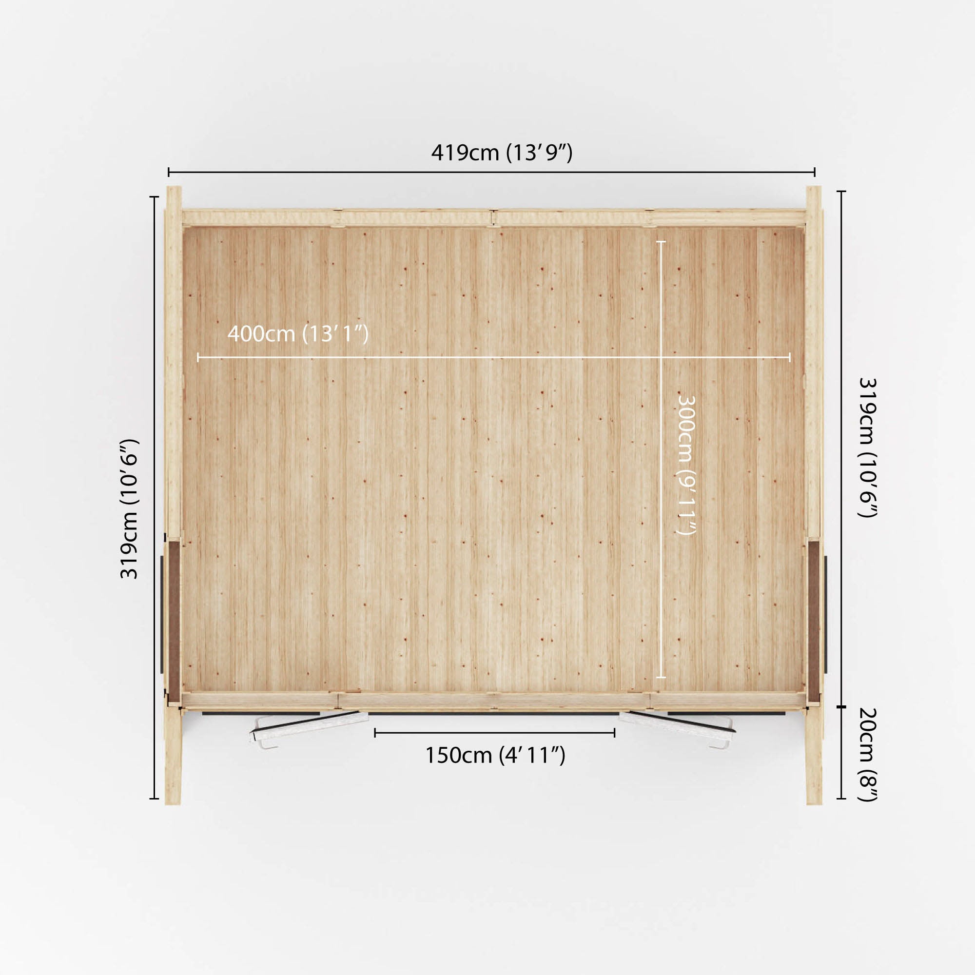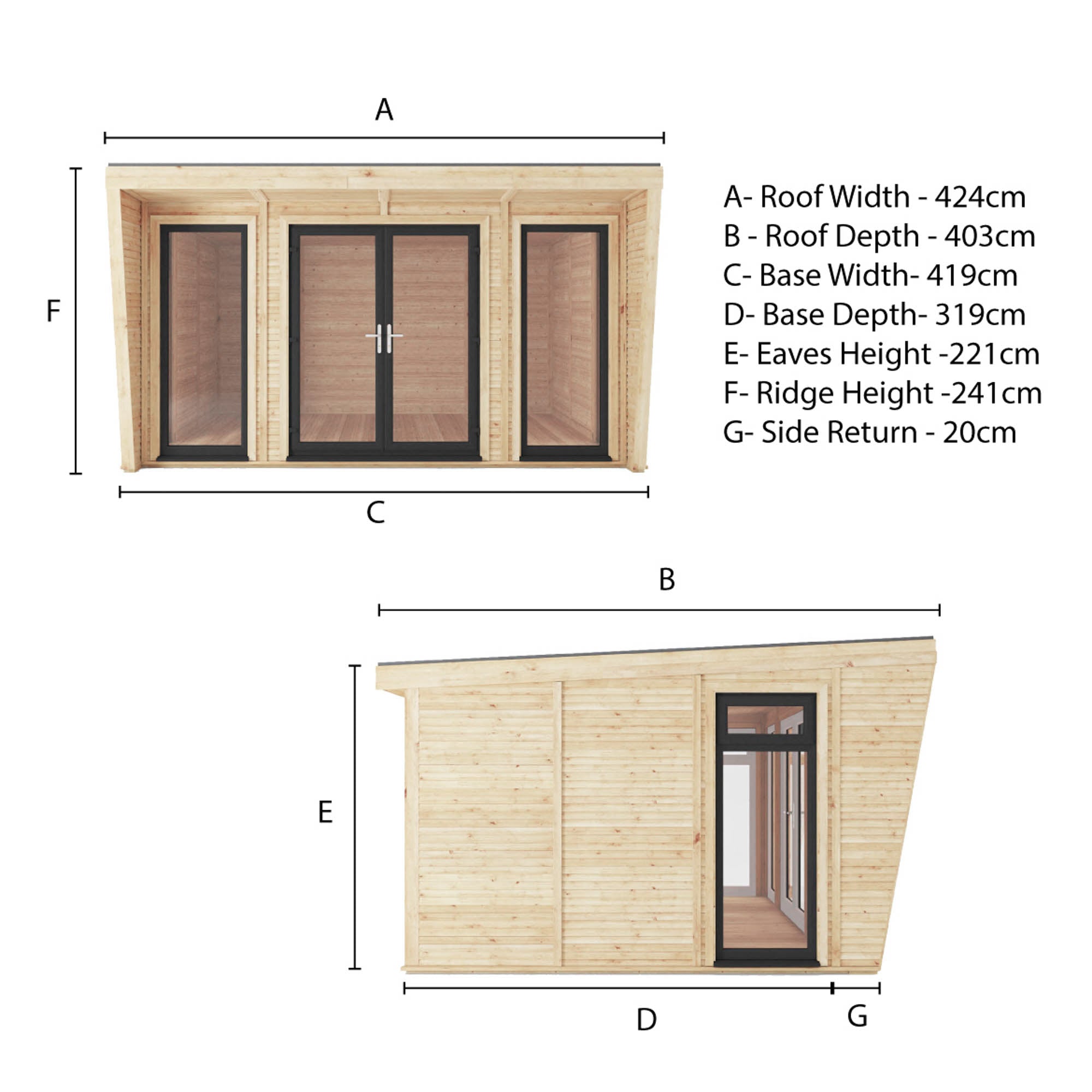 Its exterior boasts architectural elegance, featuring clean lines and a geometric silhouette. The innovative wing design adds a touch of modernity and sophistication, ensuring it stands out as a focal point in any garden. These wings also provide a sheltered porch area at the front, ideal for protection from the elements or for enjoying shade during sunny days.