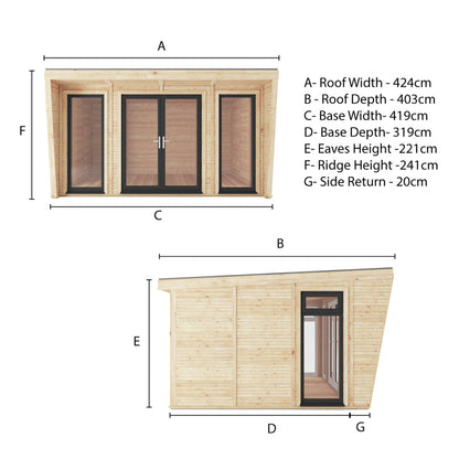 Featuring a pent roof design, the Creswell Insulated Garden Room presents a modern and streamlined aesthetic. The inclined roof allows the structure to discreetly blend into any garden setting, all while creating a warm and snug interior ambiance.