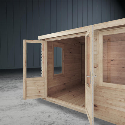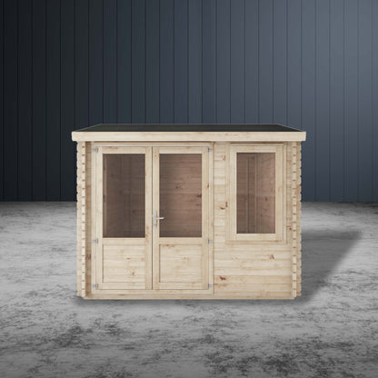 The Robin Log Cabin offers a tranquil space ideal for moments of relaxation or for creating a productive home office atmosphere. Its classic design, including an Alpine-inspired apex roof and delightful opening windows, effortlessly blends with any outdoor setting. The traditional apex roof design not only adds to the cabin's aesthetic appeal but also creates an airy interior, accommodating taller furnishings and décor.