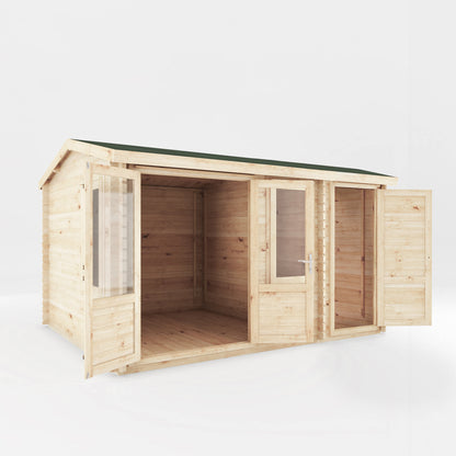 The Robin Log Cabin with Side Shed offers a spacious and inviting garden space, ideal as a relaxing hideaway or as a comfortable and productive home office space. Its classic features, including an Alpine-inspired apex roof and bright opening windows, ensure a timeless design that effortlessly blends with your surroundings. The traditional apex roof not only adds to the cabin's charm but also enhances the interior space, allowing for the incorporation of taller furniture and decorations, creating a sense of openness and flexibility.