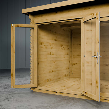 Featuring a pent roof design, the Wren Log Cabin has a modern and streamlined aesthetic. The inclined roof allows the structure to discreetly blend into any garden setting, all while creating a warm and snug interior ambience.