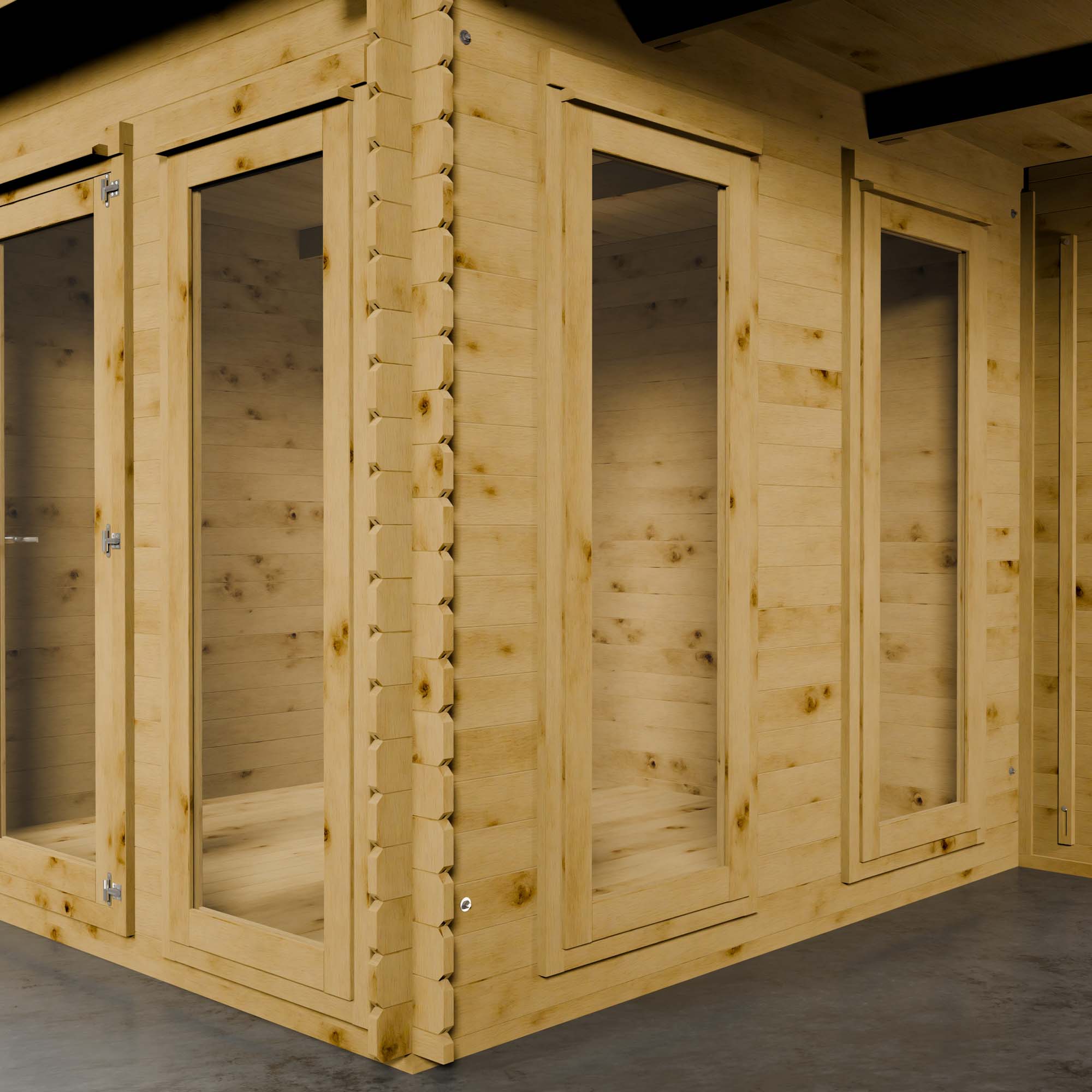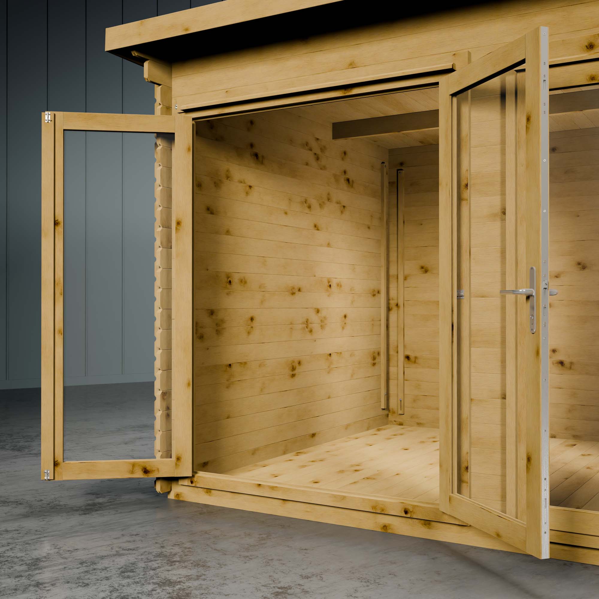 By incorporating a patio area, you can enjoy the outdoors while staying sheltered. Perfect for relaxation, it can transform into a cosy outdoor space, a hot tub hideaway, or a shaded area for children to play away from the sun. Please note, you can place the patio on either side of the building to fit your preferences. The log board thickness for the patio area is 28mm.