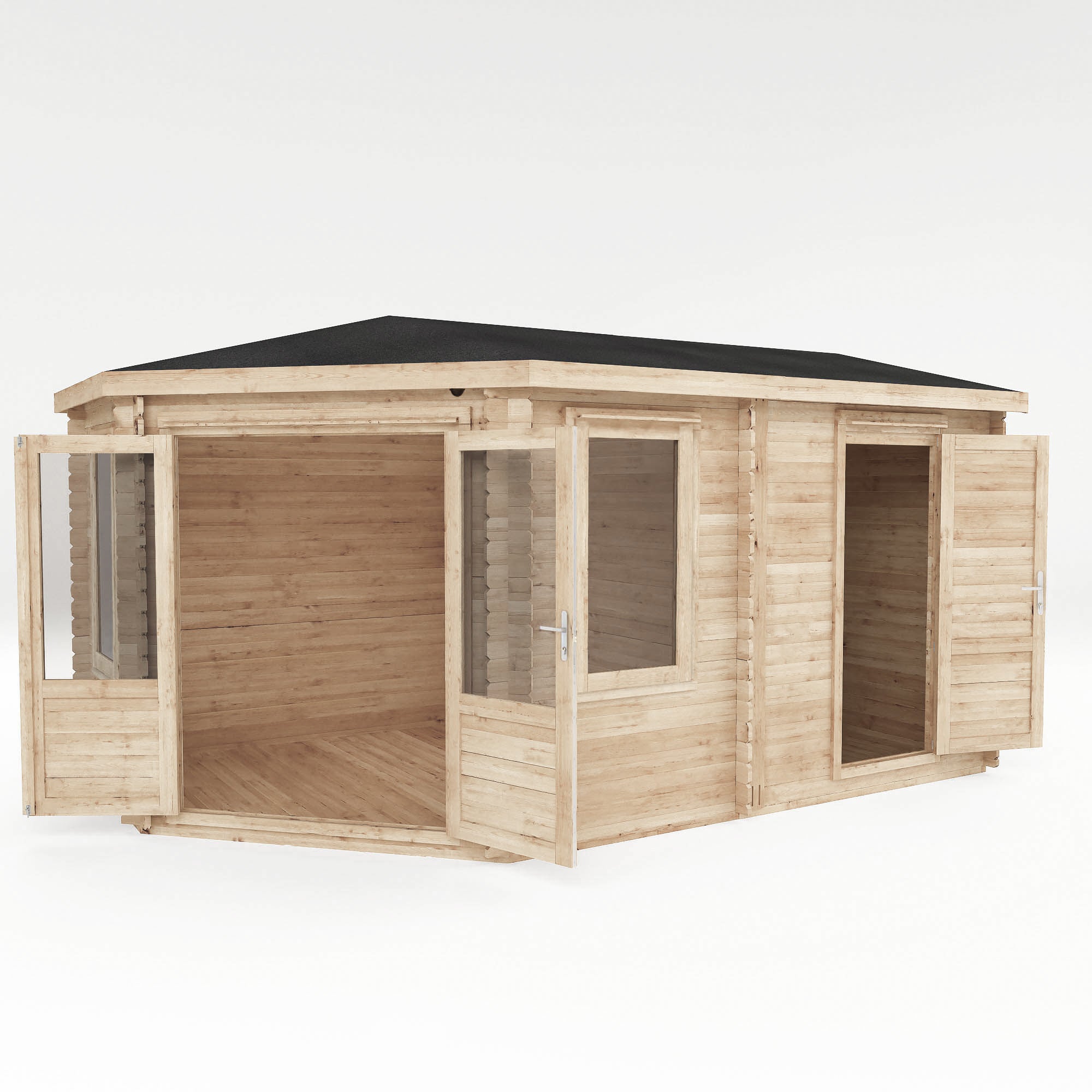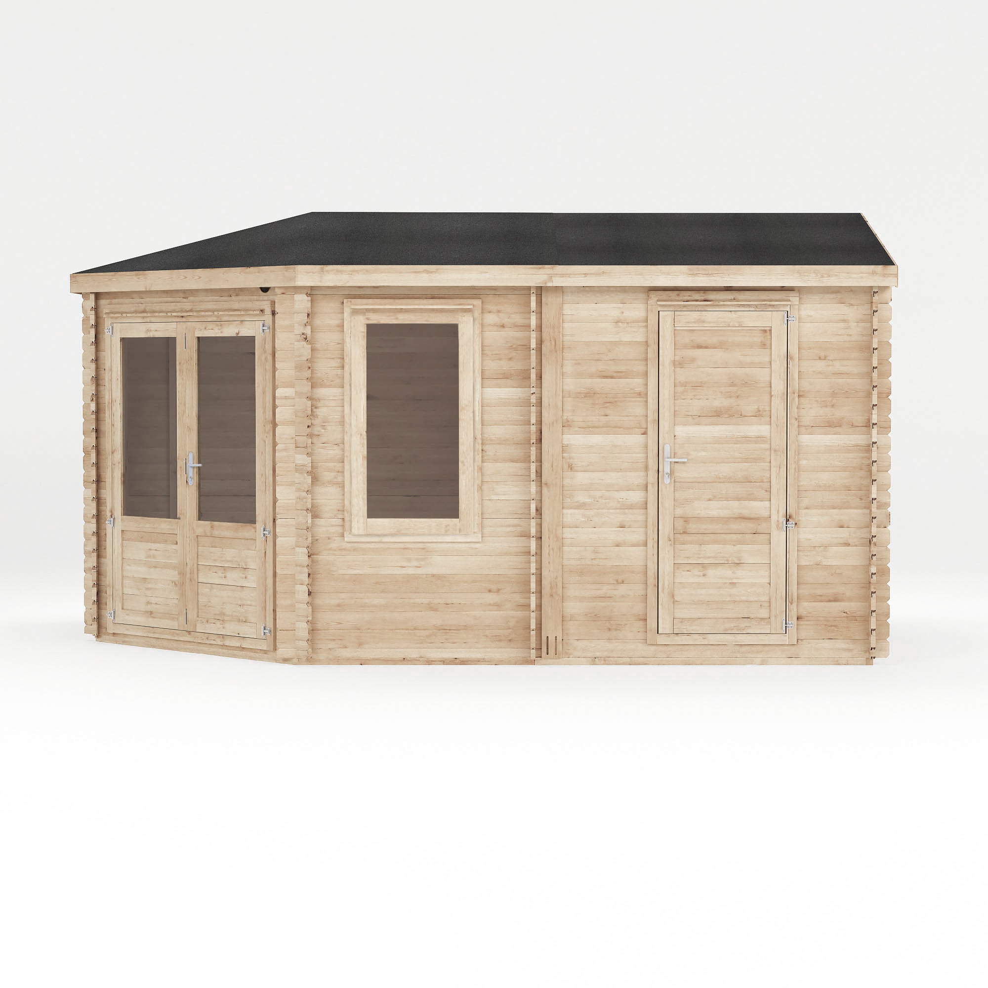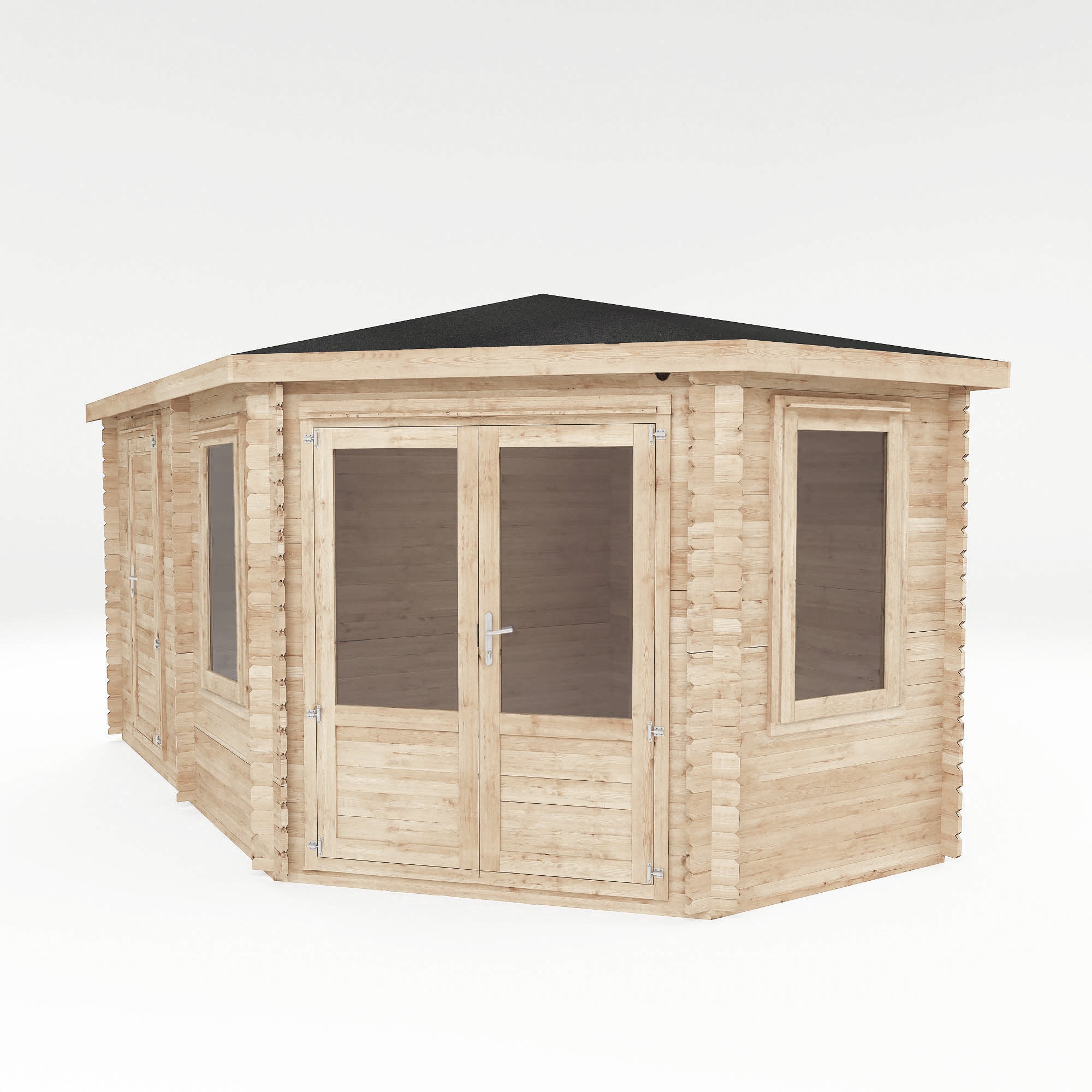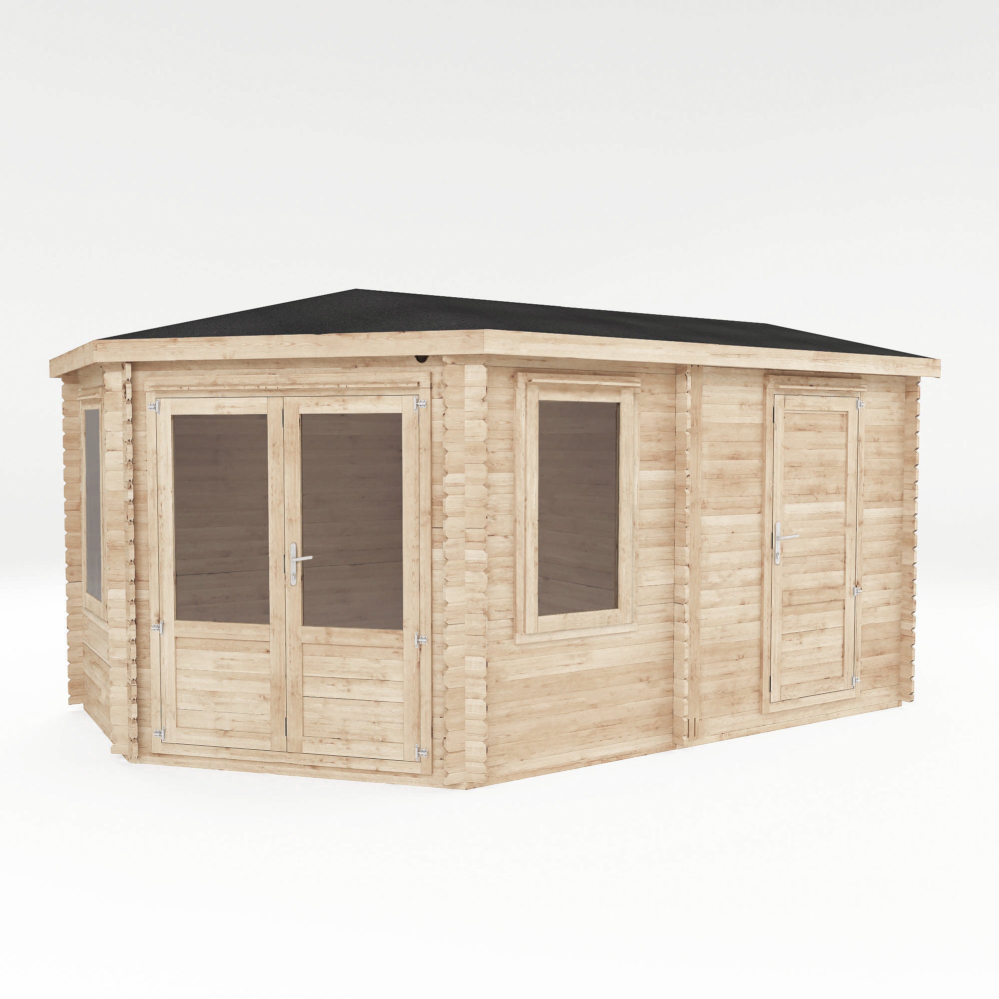 The Goldcrest Corner Log Cabin presents a chic, expansive, and modern corner design that seamlessly blends traditional elements. Its cleverly designed layout is crafted to optimise available space, perfectly nestling into the corners of your garden, offering panoramic views of your favourite outdoor space from every angle.