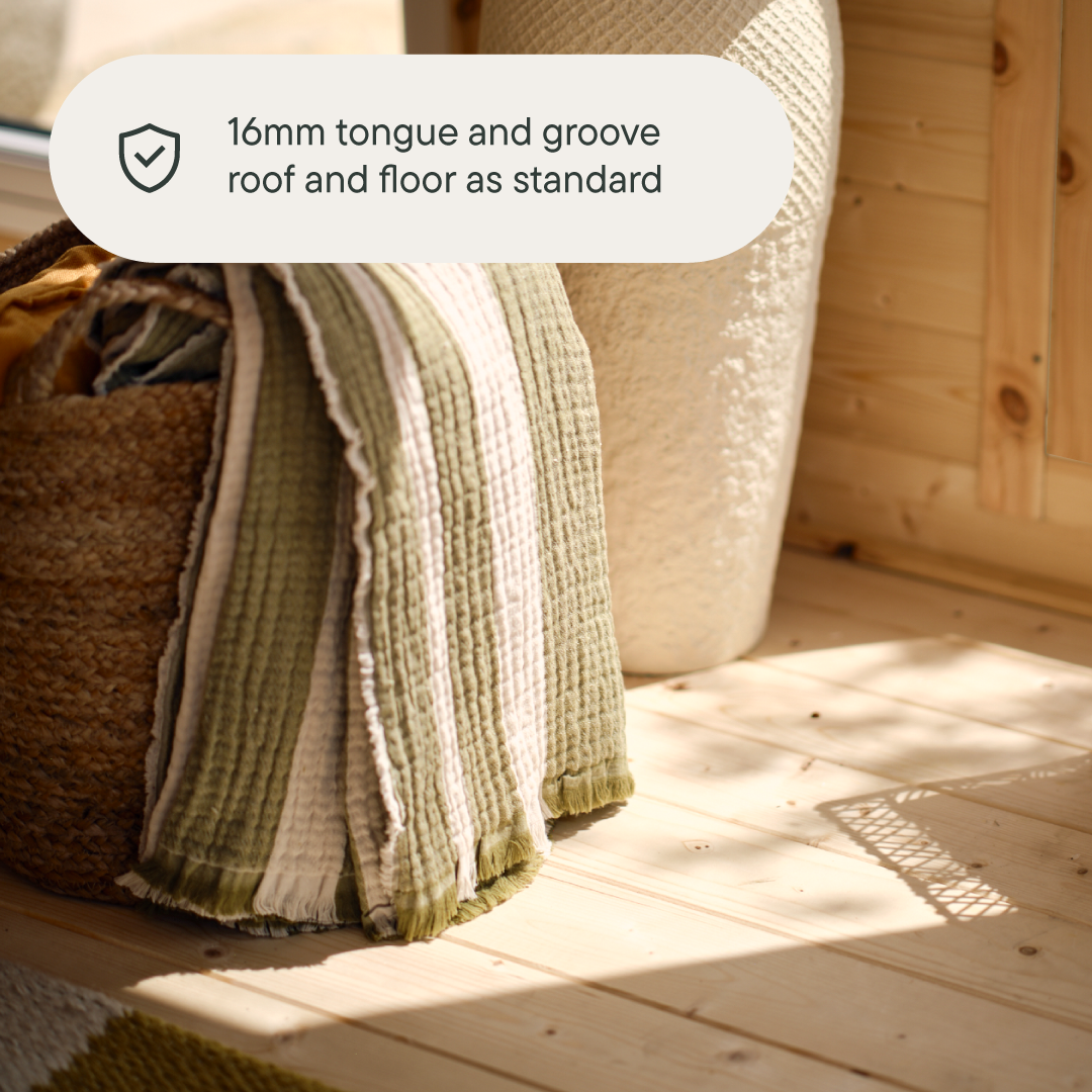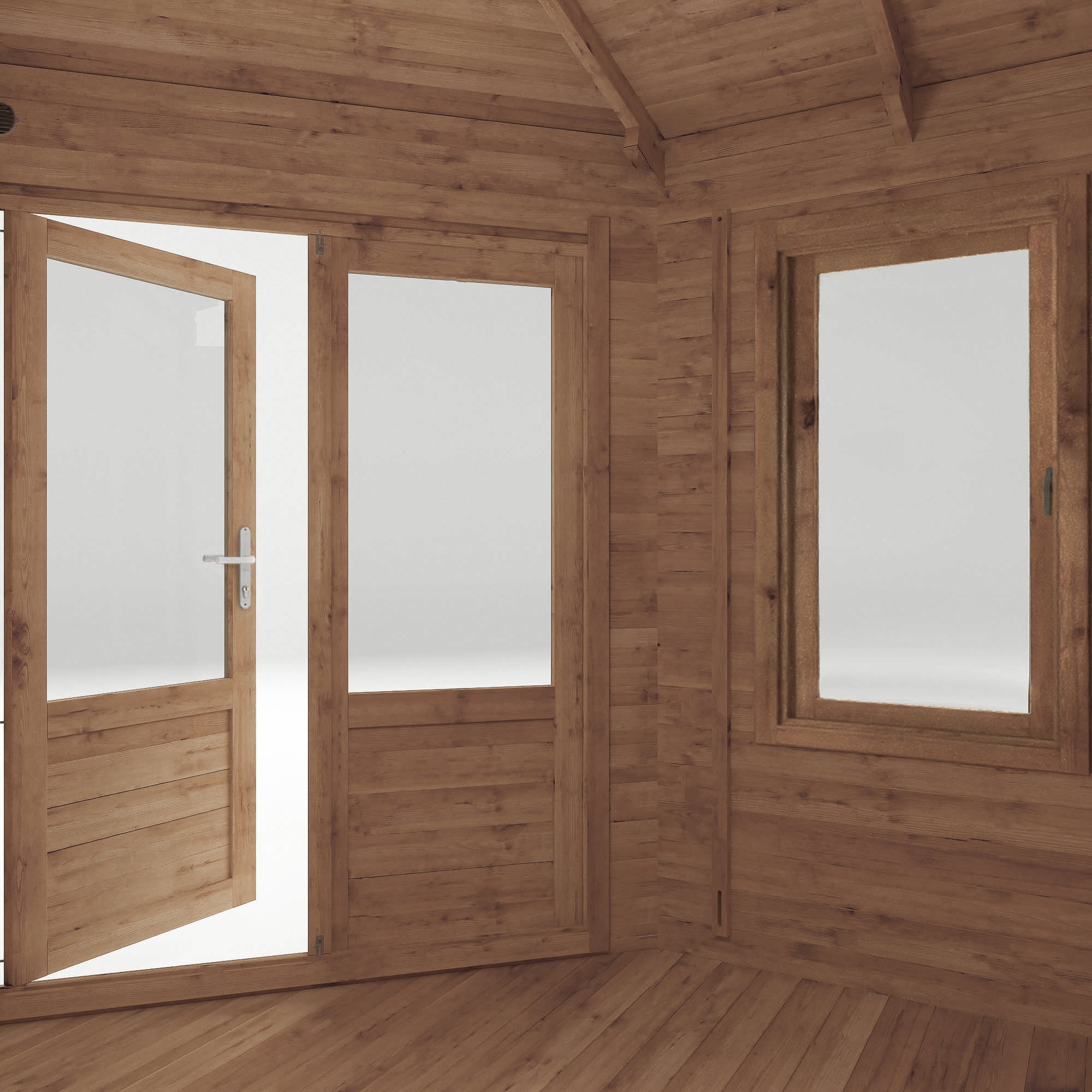 The Goldcrest log cabin from Waltons offers a choice of three log thickness options: 28mm, 34mm, or 44mm interlocking boards, all designed to suit your unique preferences. Opting for thicker log boards brings about several advantages. The heightened wall thickness improves insulation, ensuring the cabin remains adaptable and comfortable throughout the entire year, creating a cost effective space which can be used throughout the seasons. Moreover, selecting thicker walls enhances the interior's tranquillity, creating a serene space perfect for both work and play.