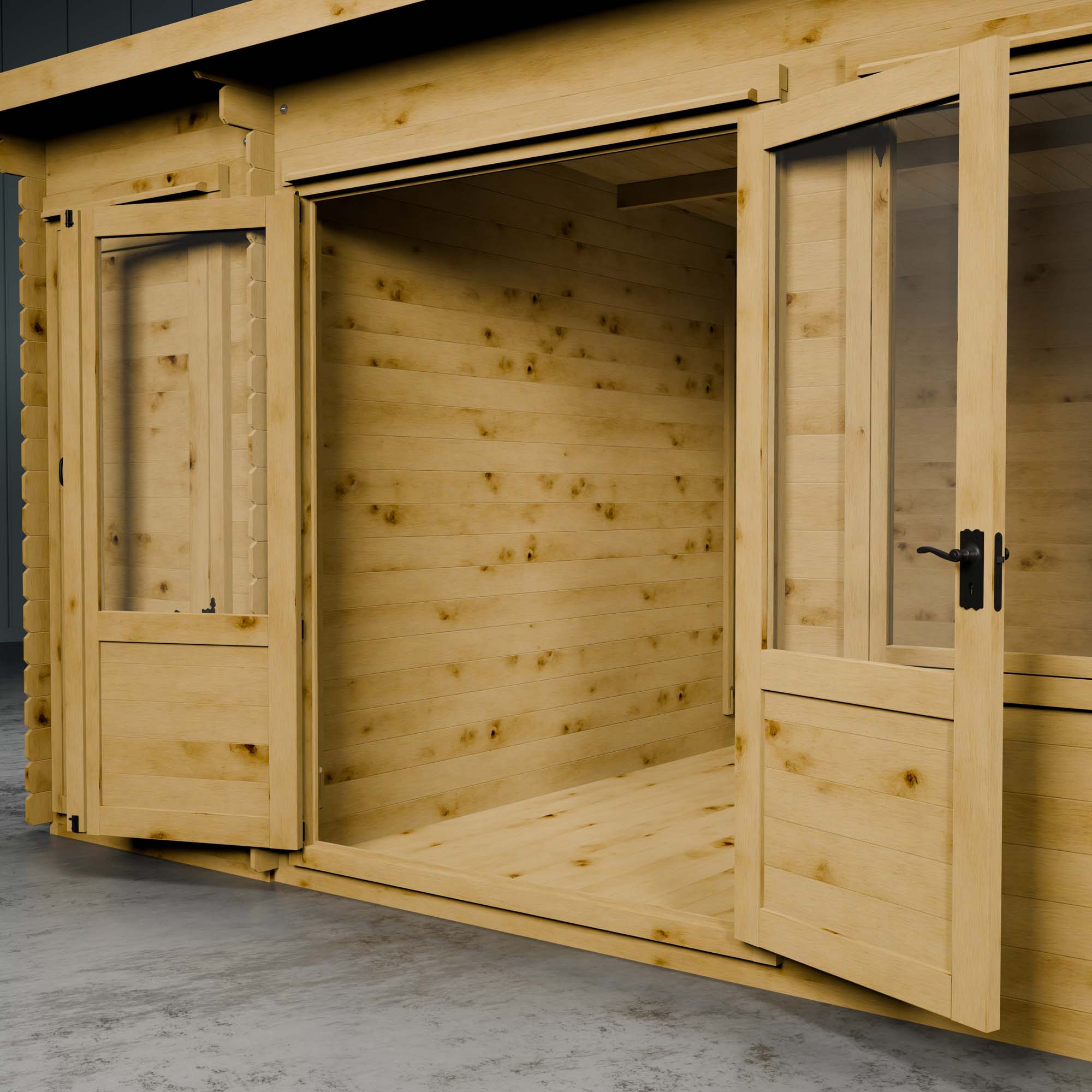 Our spacious Pent Log Cabin with Side Shed offers both style and practicality. The cabin itself features half-glazed double doors and large opening styrene windows, making the spacious interior bright and airy - ideal for creating a garden living room, home office or personal gym. With a shed to the side, accessed by a separate door, the cabin even has space for storing your outdoor furniture and gardening accessories. Opening windows not only allows you to feel the warm summer breeze, but also encourages airflow throughout the building, providing optimum ventilation.