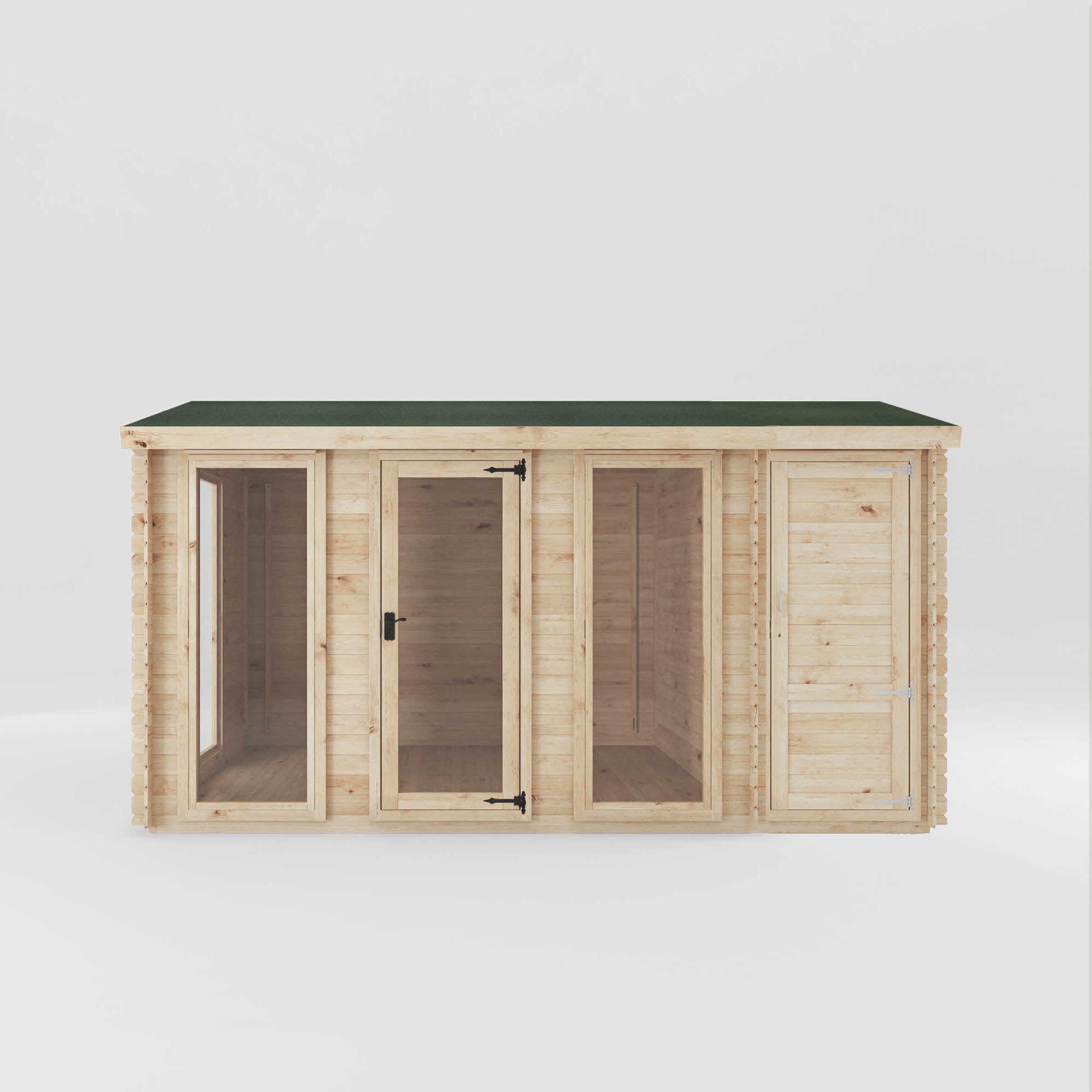 Experience the perfect blend of outdoor ambience and indoor comfort with the Value 19mm Reverse Apex Log Cabin featuring a convenient side shed. This spacious and chic garden structure is designed for those who wish to bask in their garden's beauty while seeking shelter from the sun. Boasting floor-to-ceiling SAN styrene-glazed windows on both the front and side, this cabin is bathed in natural light, creating a vibrant and inviting space.