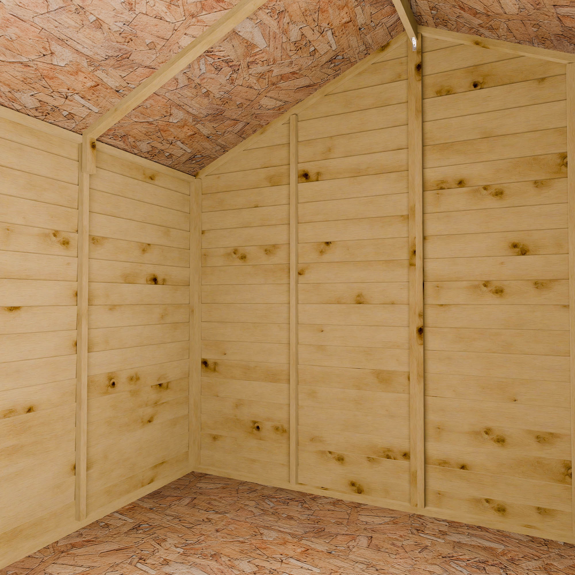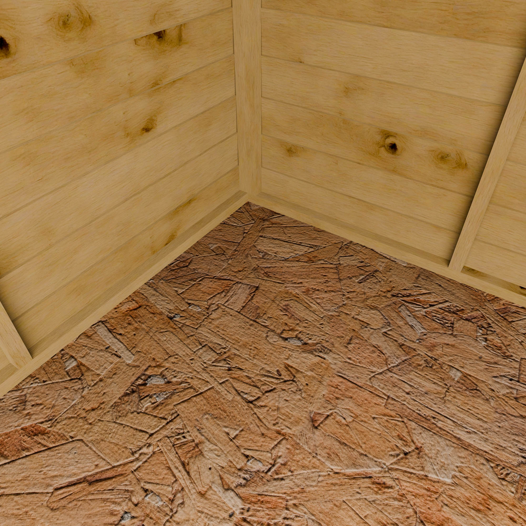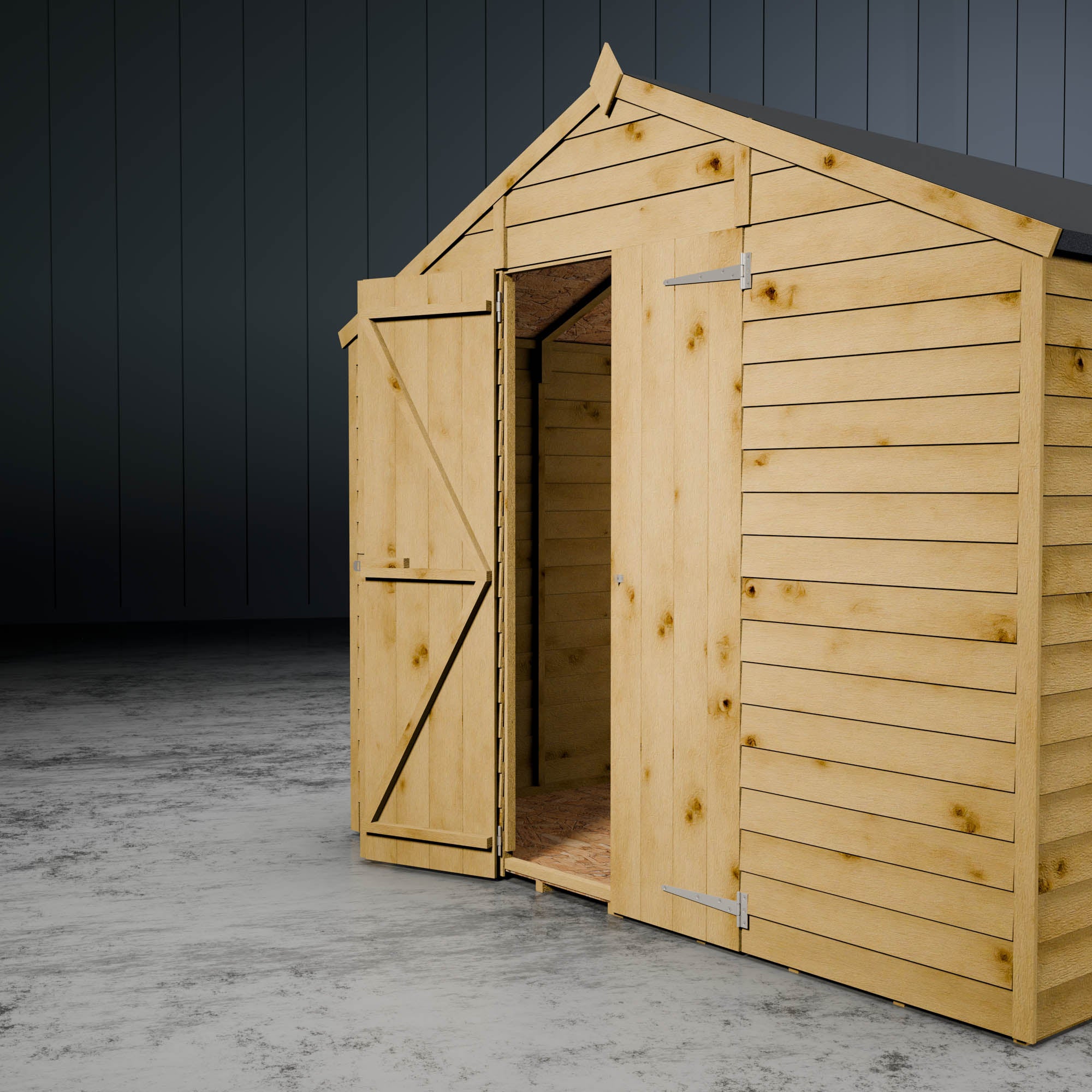 The walls of this shed are constructed using overlapping timber boards that are attached to a strong internal frame, to create durable and robust panels. This building is complete with thick wooden internal framing to support the overlap panelling, creating a rigid, long lasting structure. This shed also comes with oriented strand board (OSB) flooring and roof. This solid sheet board is manufactured from several layers of tightly compared oriented strands, ideal for every day use and general storage whilst being budget friendly.
