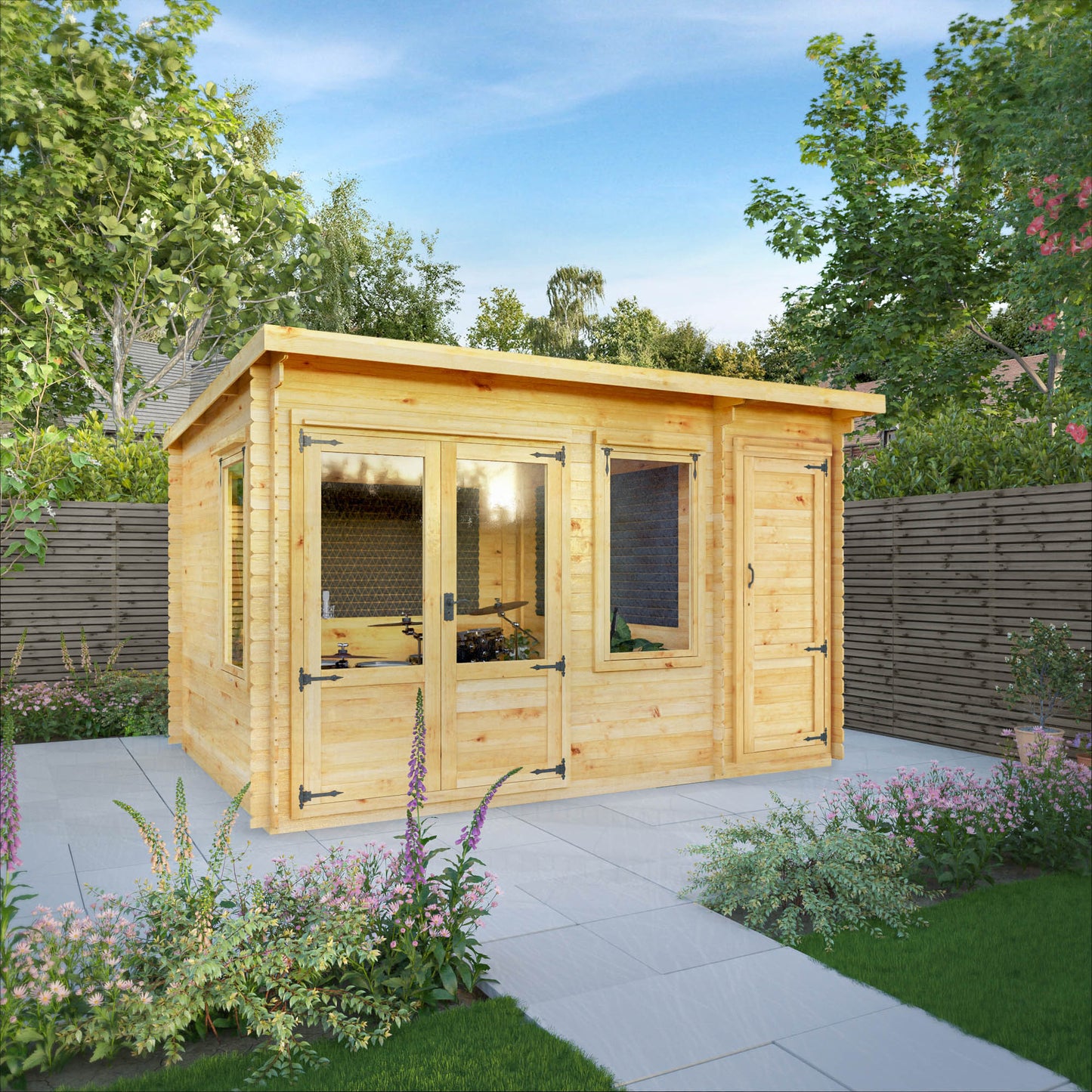Our spacious Pent Log Cabin with Side Shed offers both style and practicality. The cabin itself features half-glazed double doors and large opening styrene windows, making the spacious interior bright and airy - ideal for creating a garden living room, home office or personal gym. With a shed to the side, accessed by a separate door, the cabin even has space for storing your outdoor furniture and gardening accessories. Opening windows not only allows you to feel the warm summer breeze, but also encourages airflow throughout the building, providing optimum ventilation.